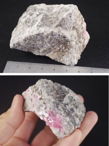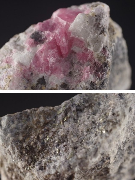 ピンク色のロードクロサイト原石と共にキラキラした金色のパイライト結晶、白色のフローライトも共生しております。