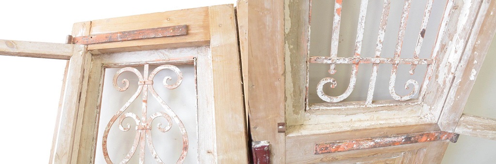 海外アンティーク パイン材 おしゃれなデザインが目を惹くアイアンフェンス入り両開きドア1対(木製扉、建具、1対2枚セット)(R-068236)