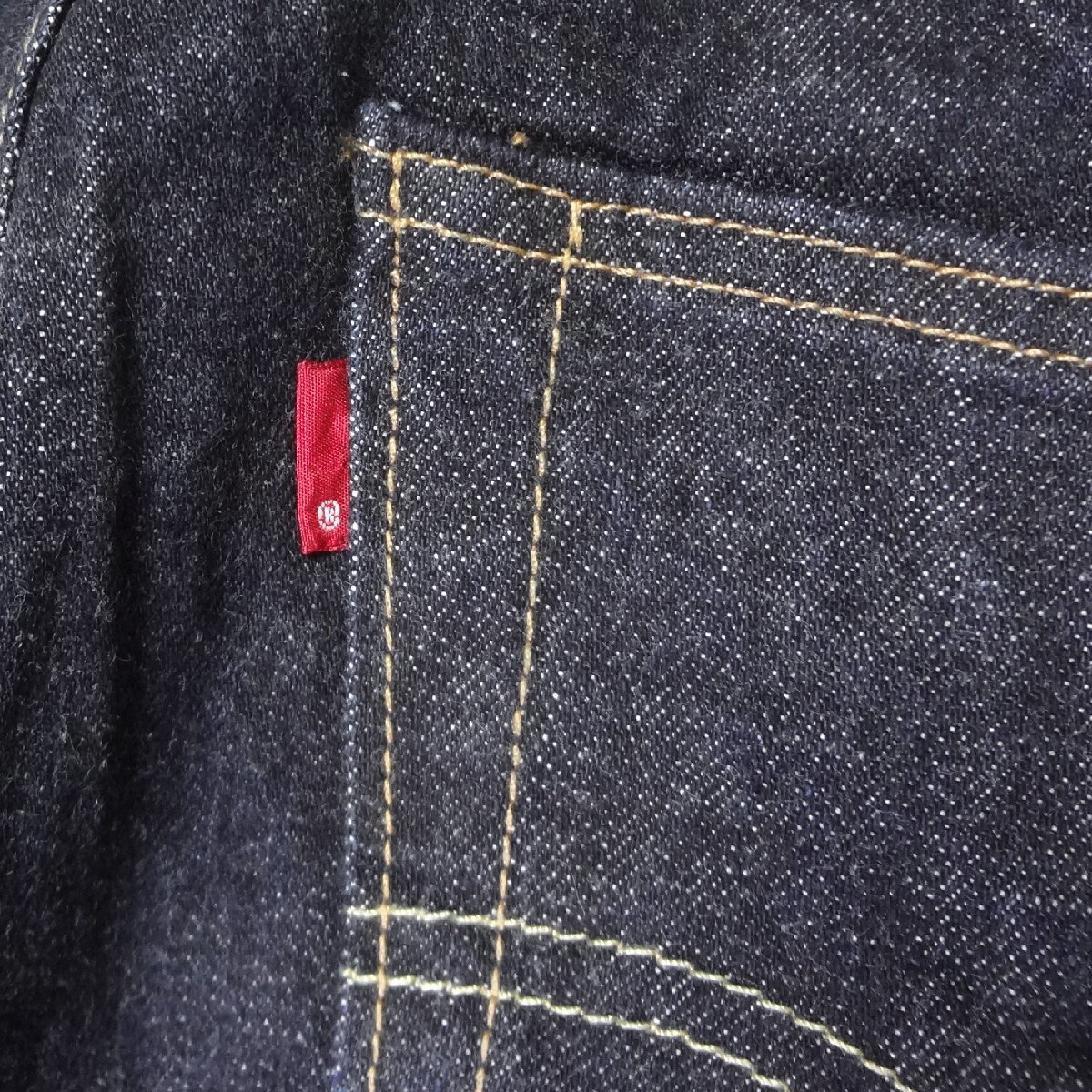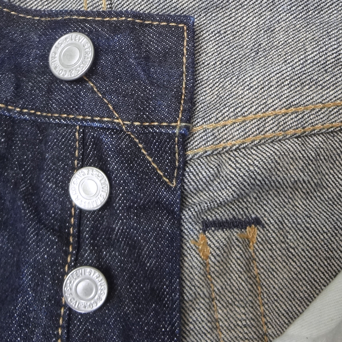 ・レジスターマークレッドタブ、ボタンフライ、V字ステッチ補強、レザーパッチ、5ポケットリベット