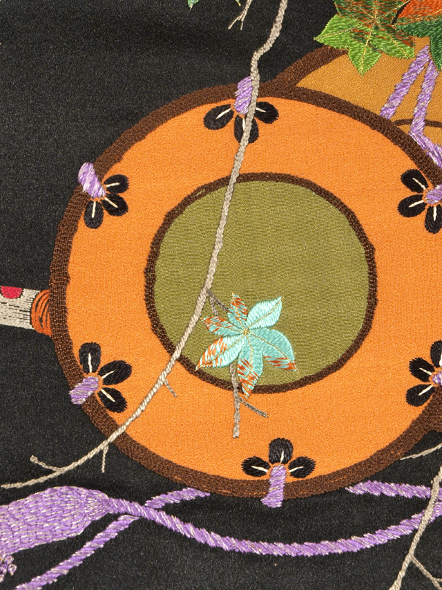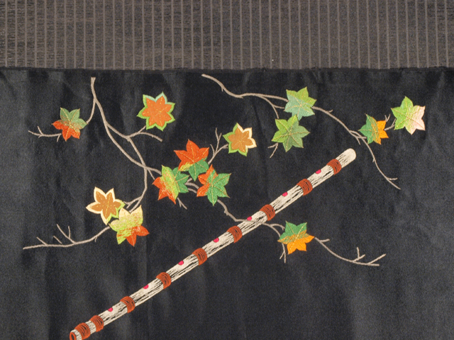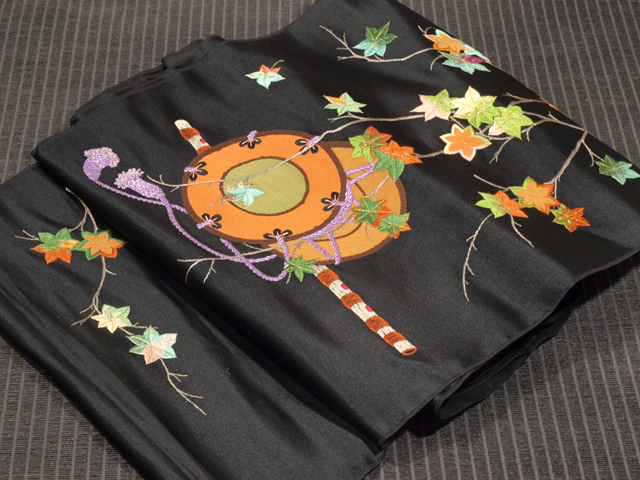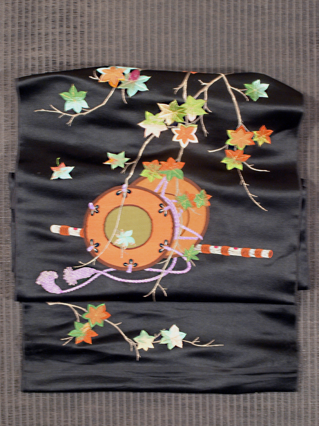 黒色の地に刺繍で楓(かえで)、横笛と鼓の和楽器の文様が刺繍で施されている、繻子織の名古屋帯の帯地です。 引き抜き結び用の柄付けになっています。裏地はありません。 大正から昭和初期ごろにつくられたと思われるアンティークのお品で、解かれた帯反の状態になっています。ろまんの感じられる意匠が立体感のある刺繍であらわされています。 画像のとおり、両耳付近に縫い跡はありますが、そのほかに目につくしみやよごれなどのダメージはなく、この時代のものとしてはとてもきれいな状態なので、お仕立てをすればご着用は可能です。 |