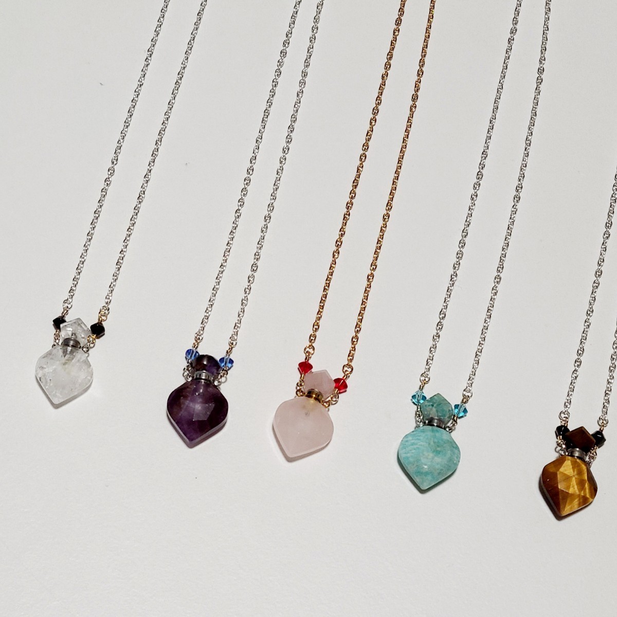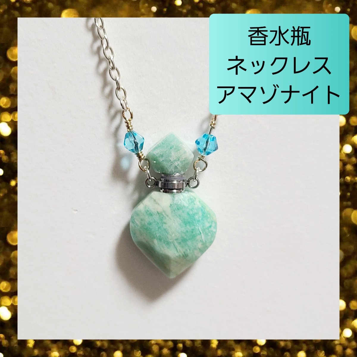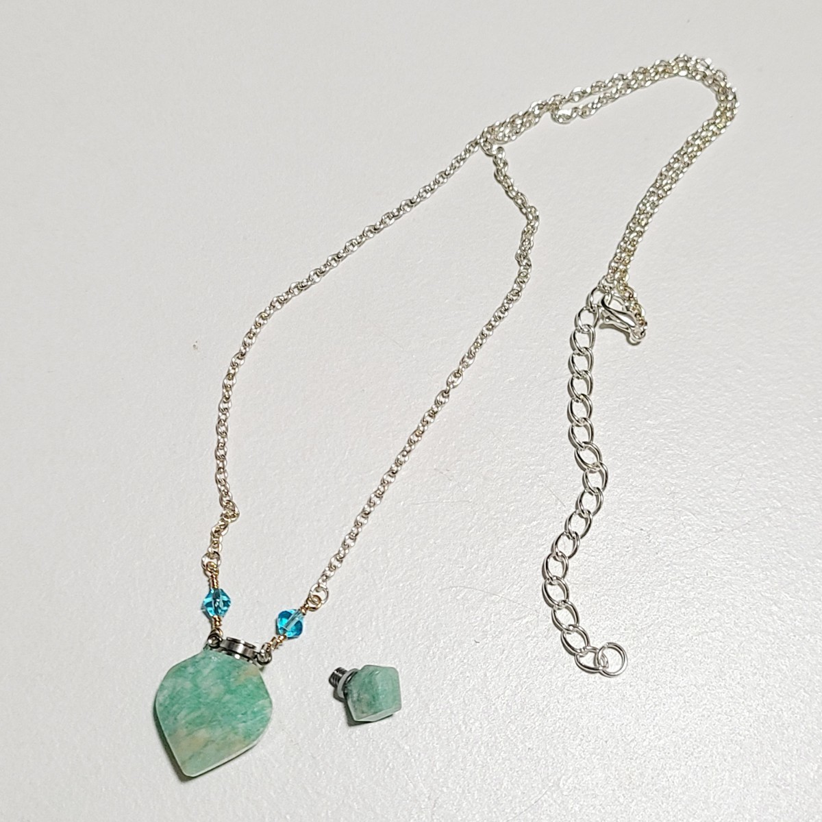 天然石問屋から買い付けた質の高いアマゾナイトで香水瓶のネックレスを作製しました。