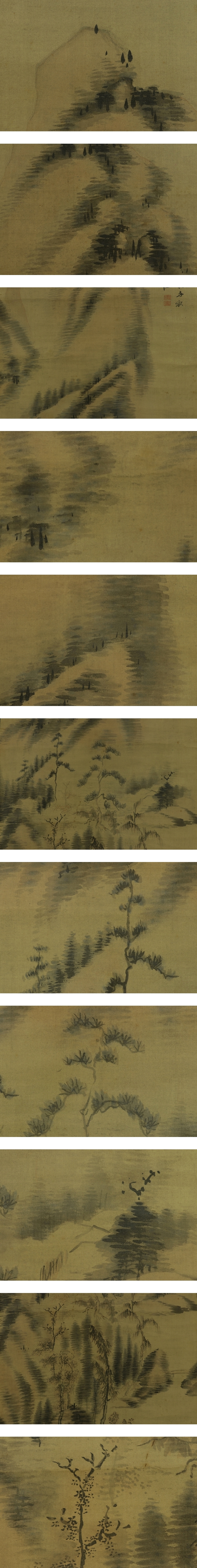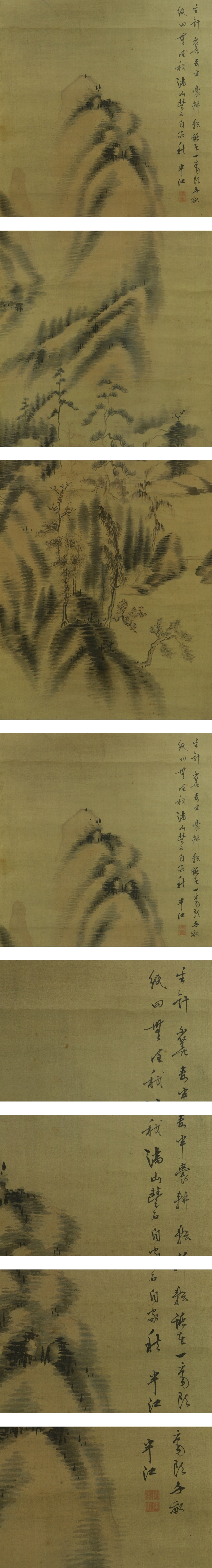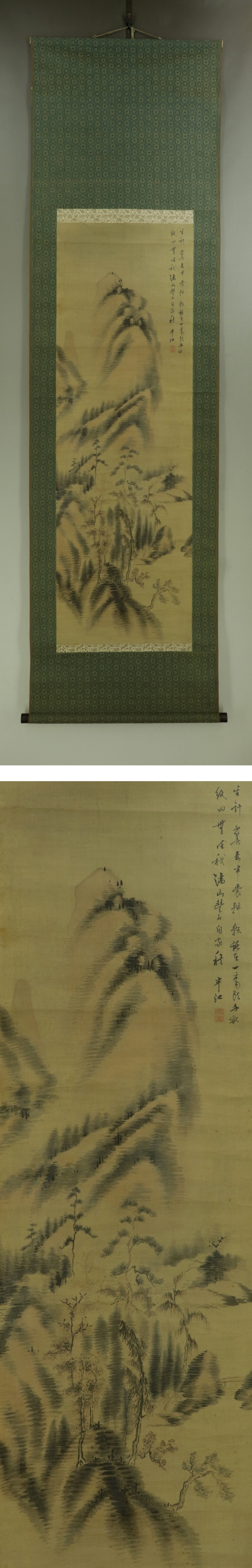 岡田半江 おかだ-はんこう(1782-1846) 江戸時代後期の画家。 天明2年生まれ。岡田米山人の子。 父から書画を学び、伊勢津藩大坂蔵屋敷に仕えた。40歳を過ぎて職を辞し、 頼山陽、田能村竹田らと交友を結び、緻密精細な筆致による山水画を得意とした。 弘化3年2月8日死去。65歳。大坂出身。 名は粛。字は子羽。通称は宇右衛門。別号に寒山、独松楼。 本紙は、染み、汚れ、強い折れ、皺、ヤケがあります。 表装は、染み、汚れ、折れ、皺、虫食い、破れ、ほつれ、ヤケがあります。 【サイズ】 作品 横約40.5cm×縦約126cm 表装 横約56.5cm×縦約203cm |