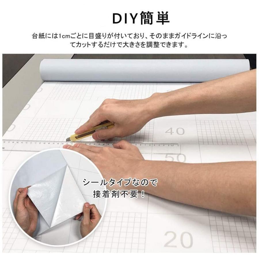 裏にガイドラインと粘着剤がついているので、ガイドラインに沿ってカットして調整できます。また剥離紙を剥がせばそのまま貼ることができます。柄合わせも可能です。