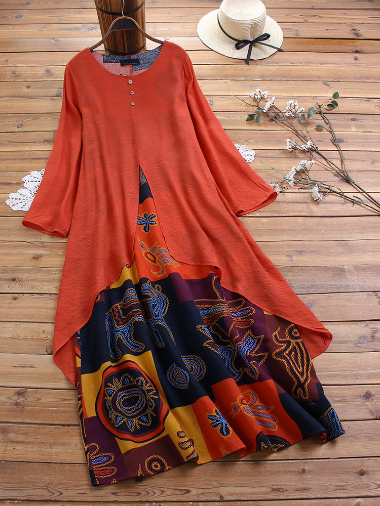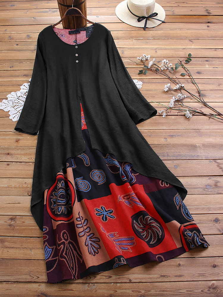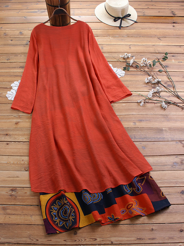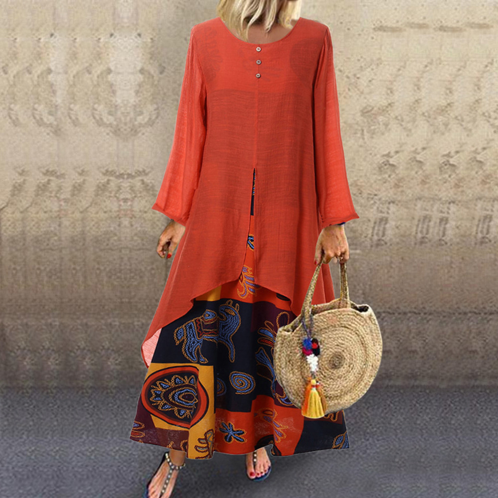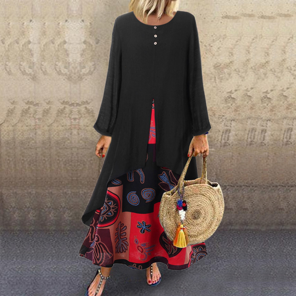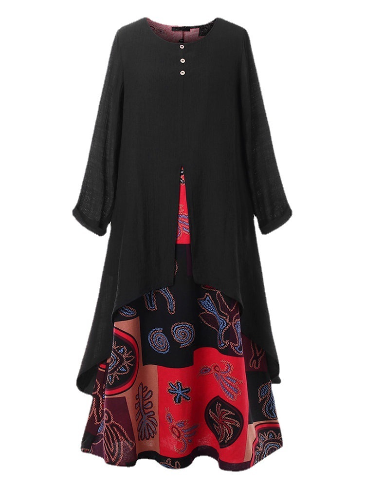 新入荷 秋 アジアンエスニック柄がおしゃれな重ね着風ワンピ ロングスカート XLサイズ以上