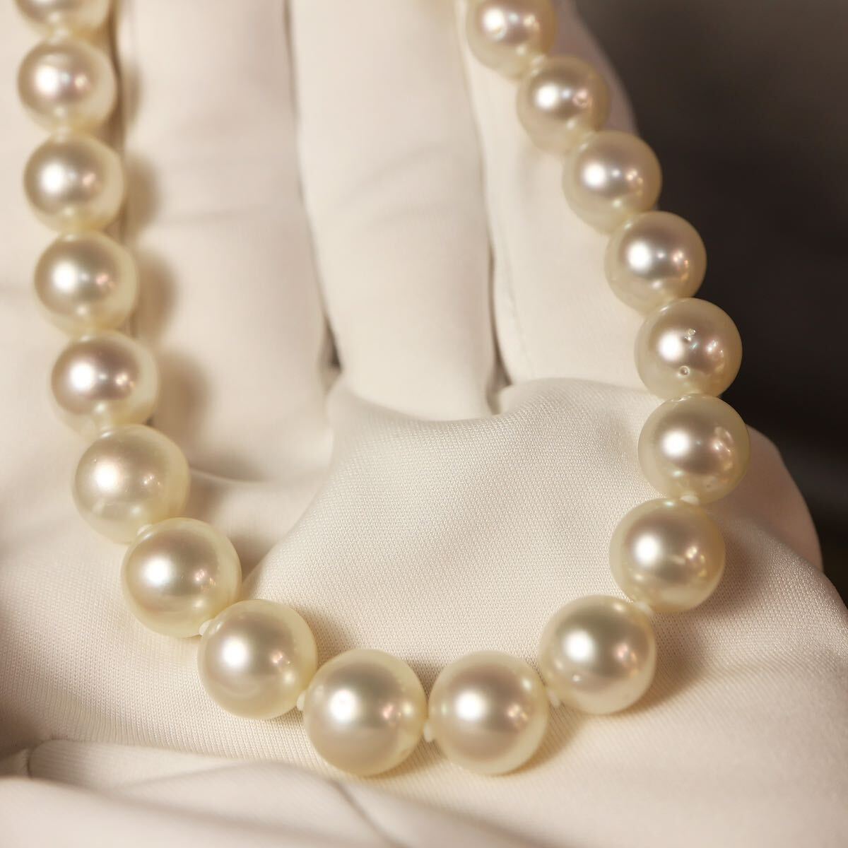 【コメント】:純白色が美しい南洋パールネックレスです。多少のエクボ等がございますがテリも強く、おすすめのネックレスです。