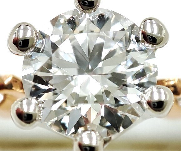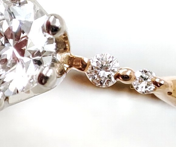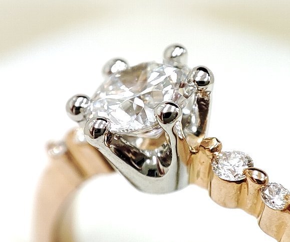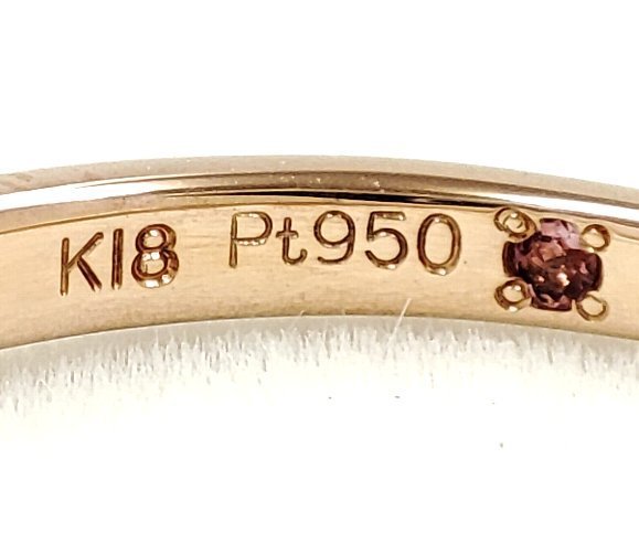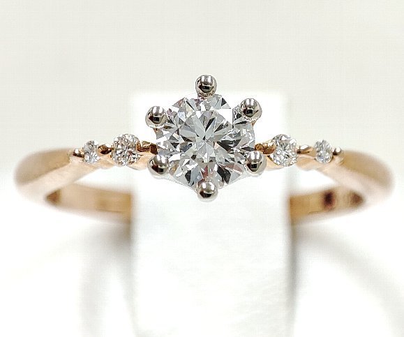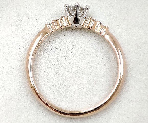 0.231カラット Dカラー VS-2クラス EXCELLENTカットの高品質な天然ダイヤモンドを6本爪ティファニータイプのプラチナ950枠に石留めされ脇には 合計 4ピース の天然ダイヤモンドをリングの肩部分に石留めデザインされたリングです。脇ダイヤモンドのクラリティは主観になりますが、SIクラス以上に揃えられたこちらも高品質なダイヤモンドで輝きは強く大変綺麗です。 素材は、18金ピンクゴールドとプラチナ950のコンビ地金です。リングサイズは 8号です。リング内側にピンク色の天然石が 1ピース入っております。こちらのお品は素材の性質上、サイズ直しは出来兼ねますので ご了承くださいませ。 |