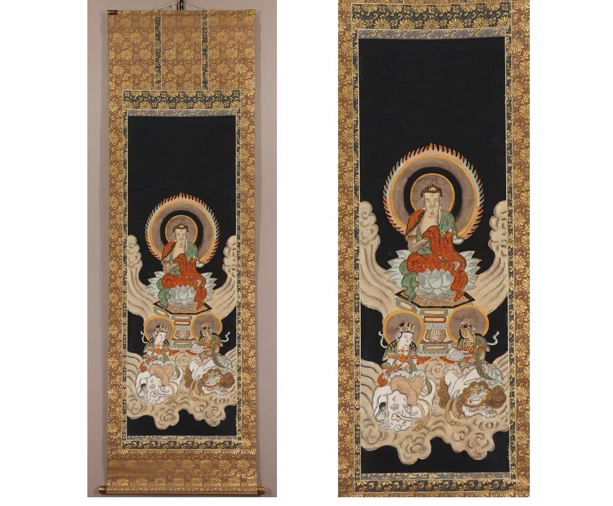 【無落款】◆釈迦三尊図◆仏画◆釈迦如来◆文殊菩薩◆普賢菩薩◆肉筆◆絹本◆掛軸◆s796