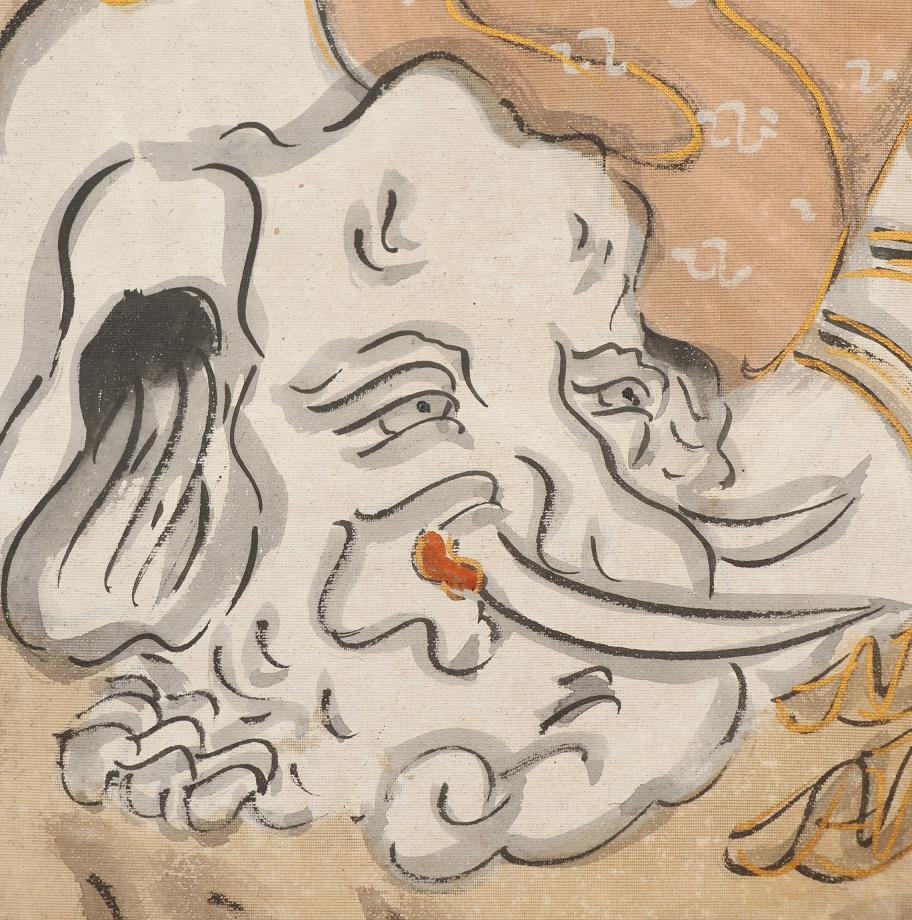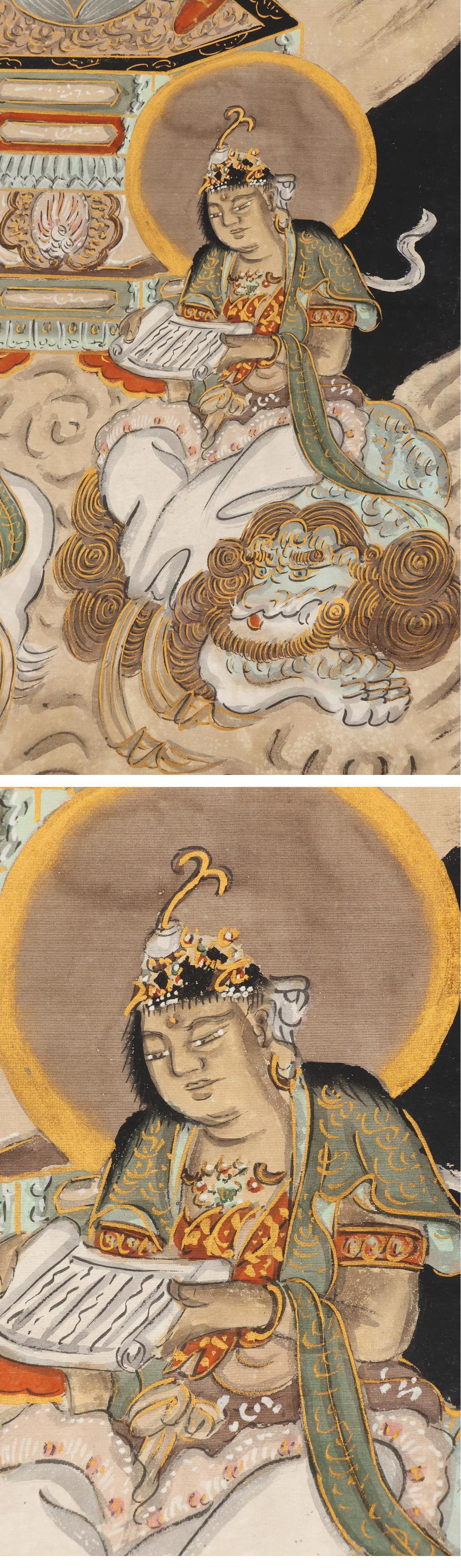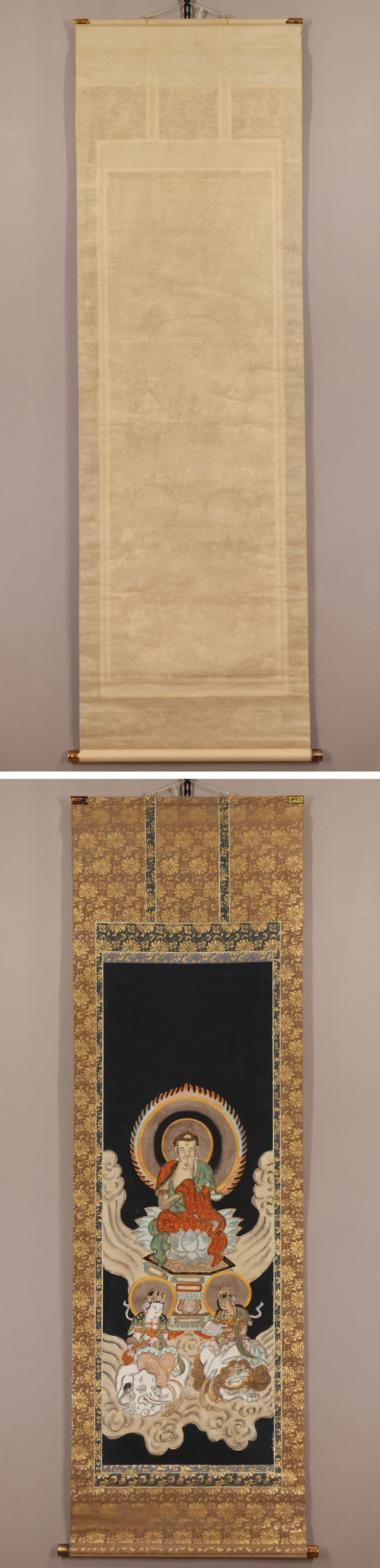 この作品は、肉筆・絹本により『釈迦三尊図』が描かれております。