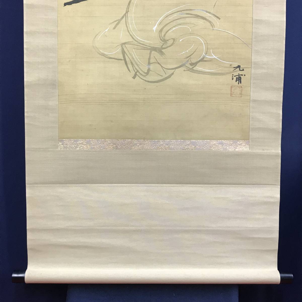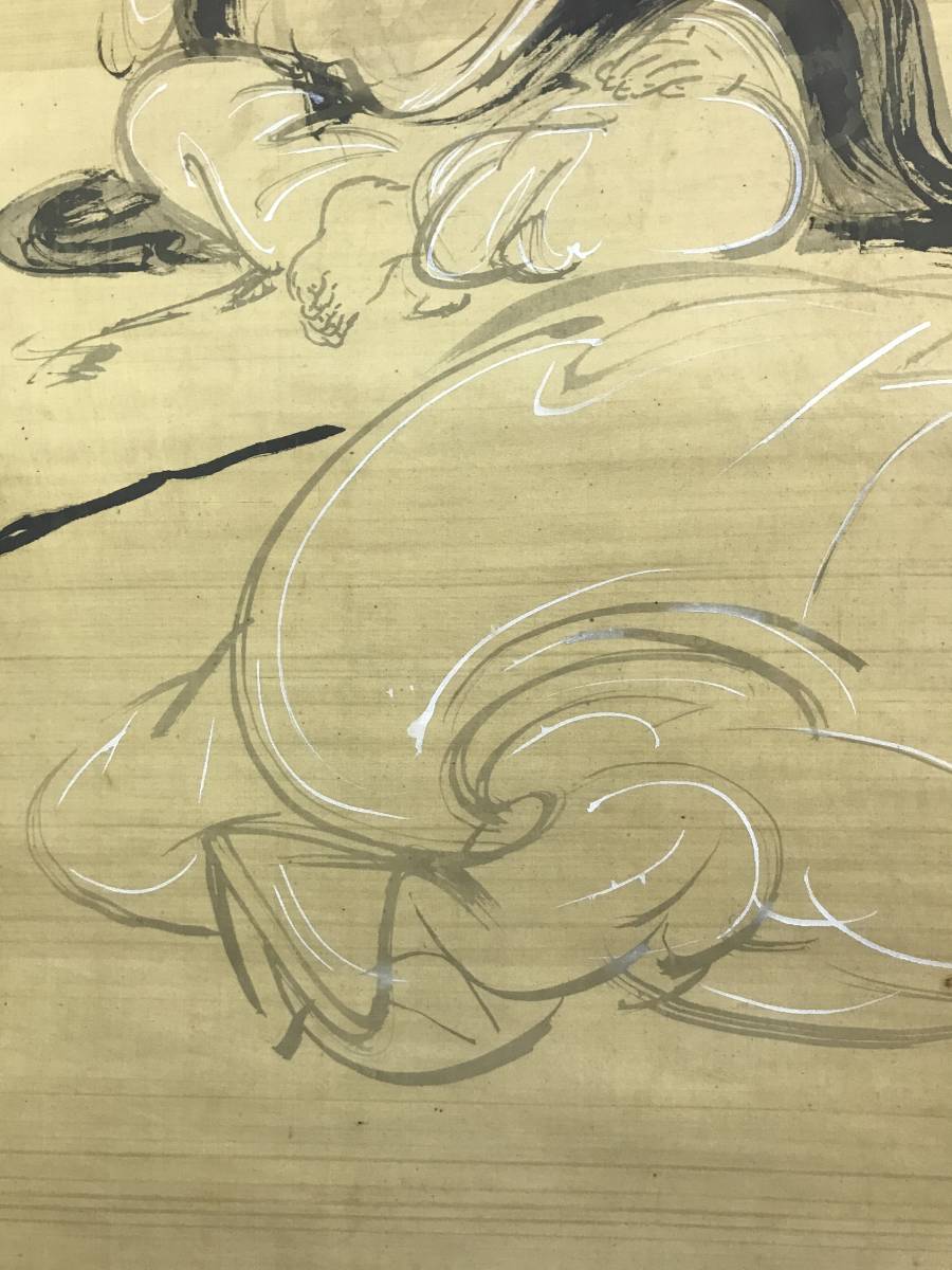 【作品状態】 本紙は絹本肉筆です。  本紙は薄汚れ、全体に多数の汚れシミあります。表装は多少の薄汚れあります。