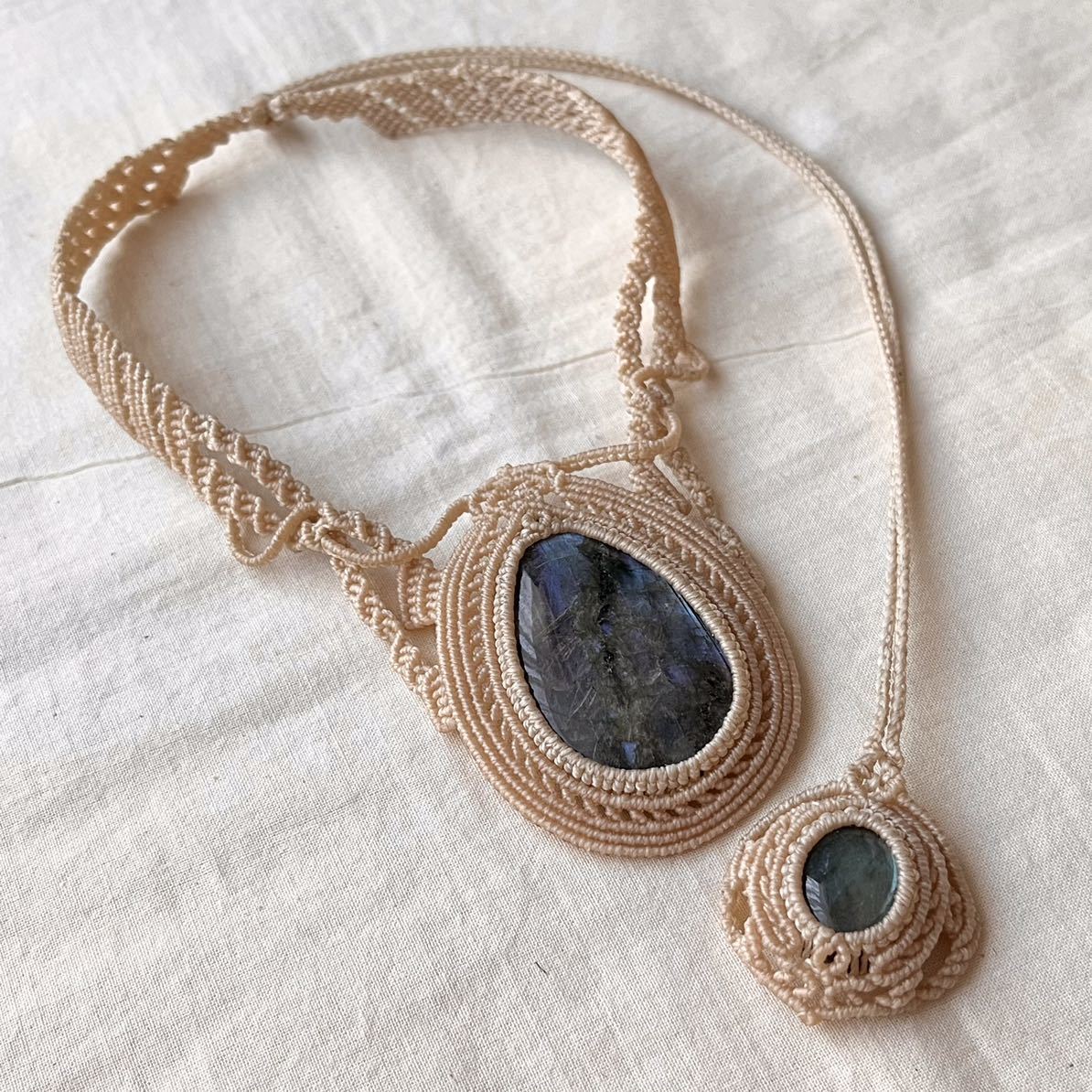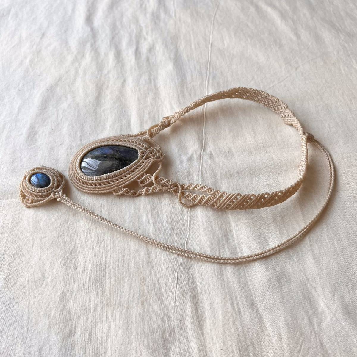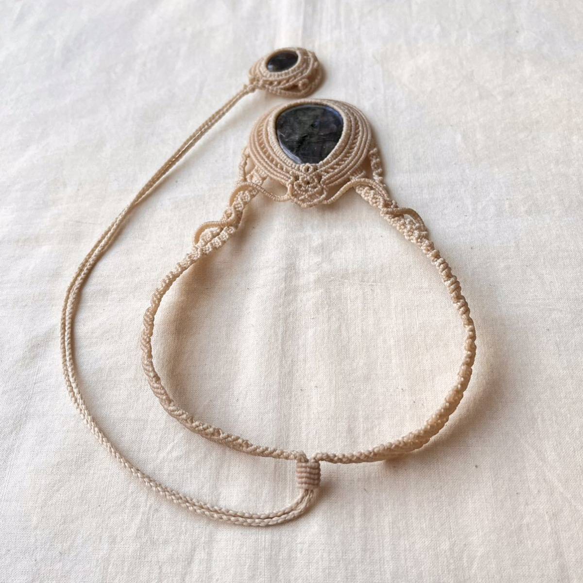 マクラメは糸を固く結びながら装飾を施す技法です。糸端は焼き留めで仕上げております。その為ニットやオーガンジーなどのザックリした生地に引っかかる場合があります。