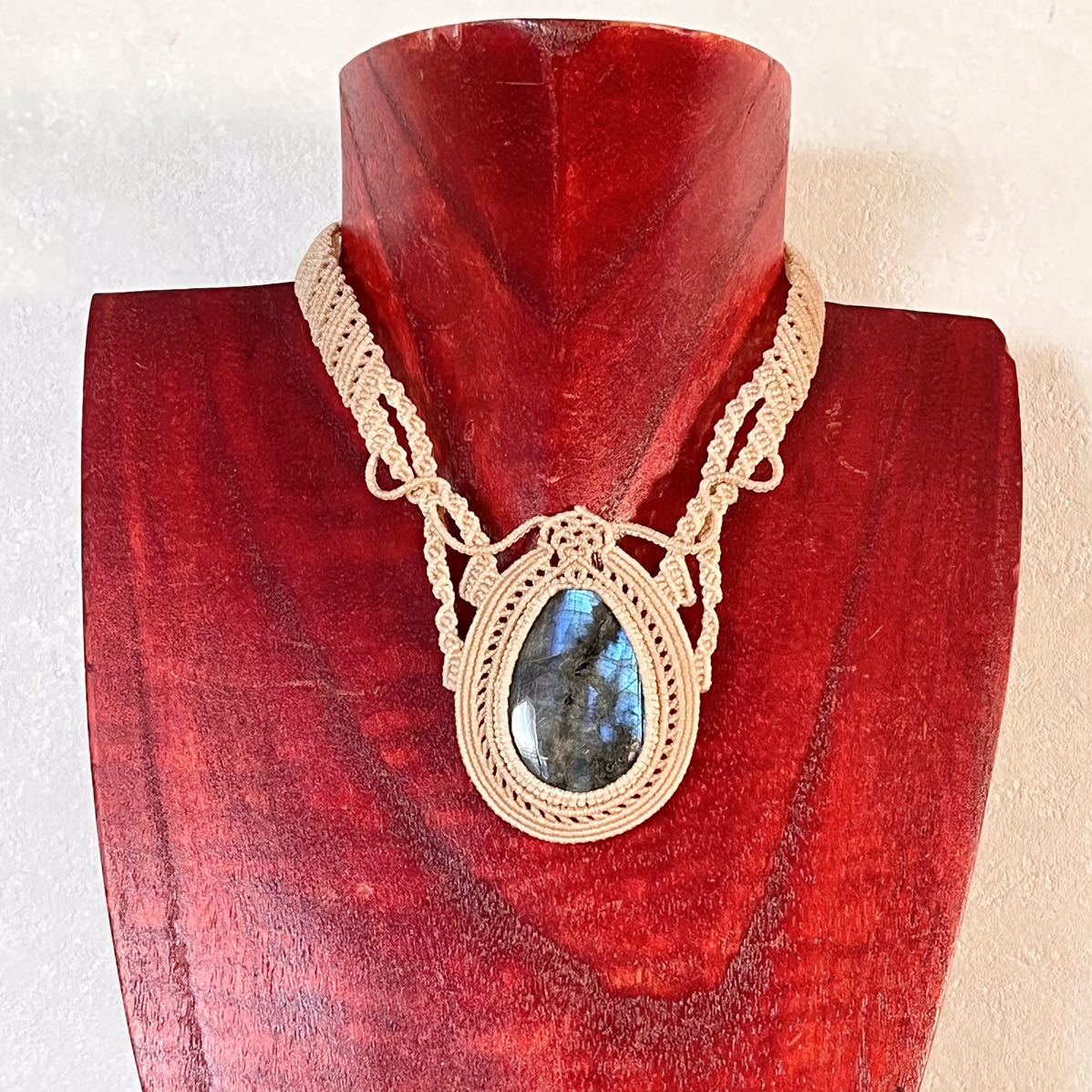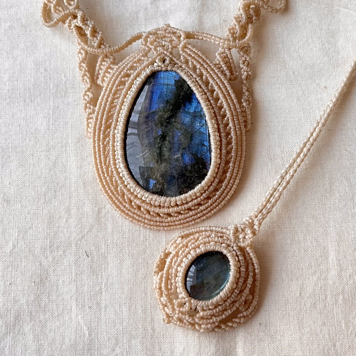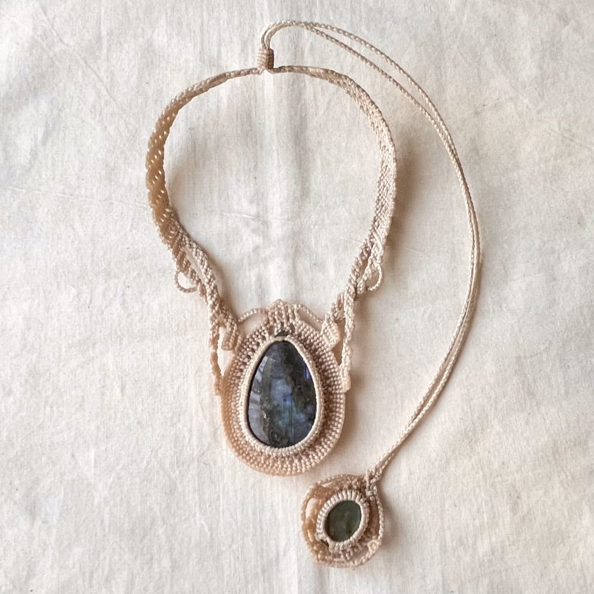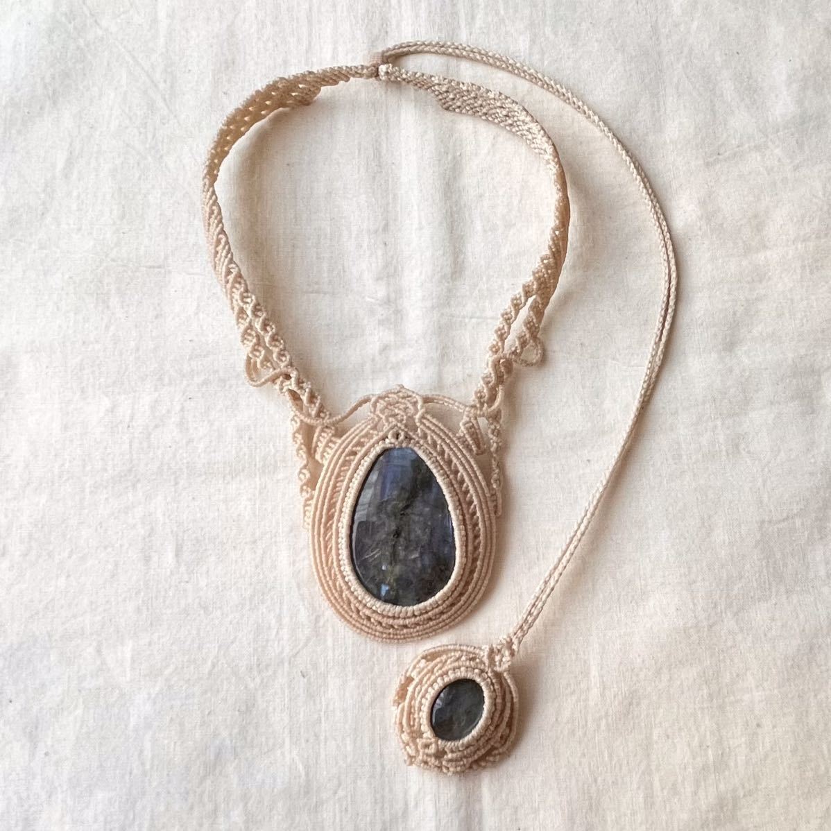 マクラメは糸を固く結びながら装飾を施す技法です。糸端は焼き留めで仕上げております。その為ニットやオーガンジーなどのザックリした生地に引っかかる場合があります。