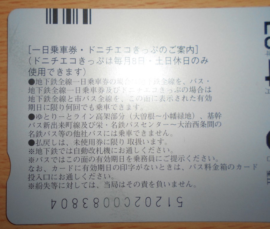 バス・地下鉄全線一日乗車券 小児用 使用済み ドニチエコきっぷ 中古 1枚