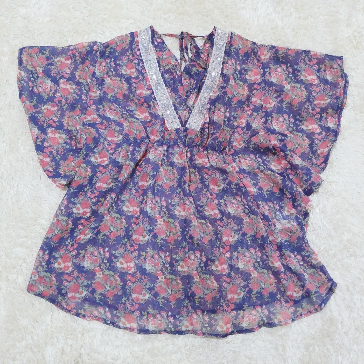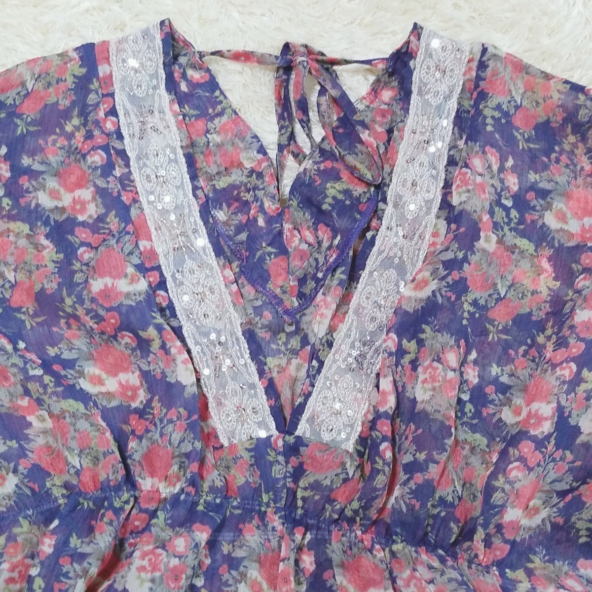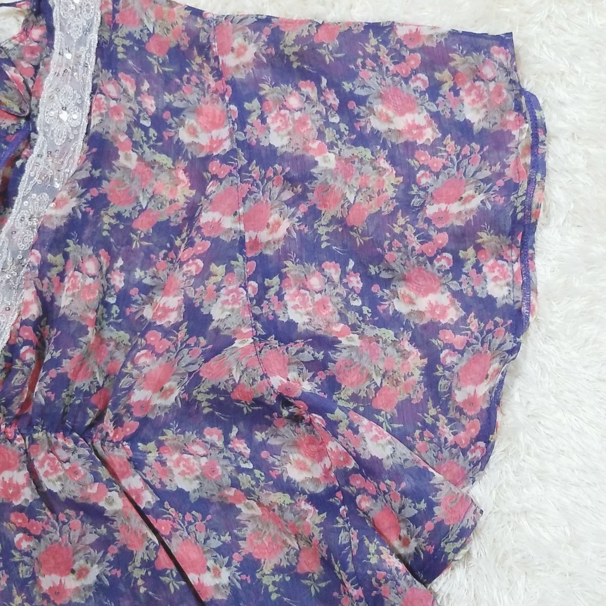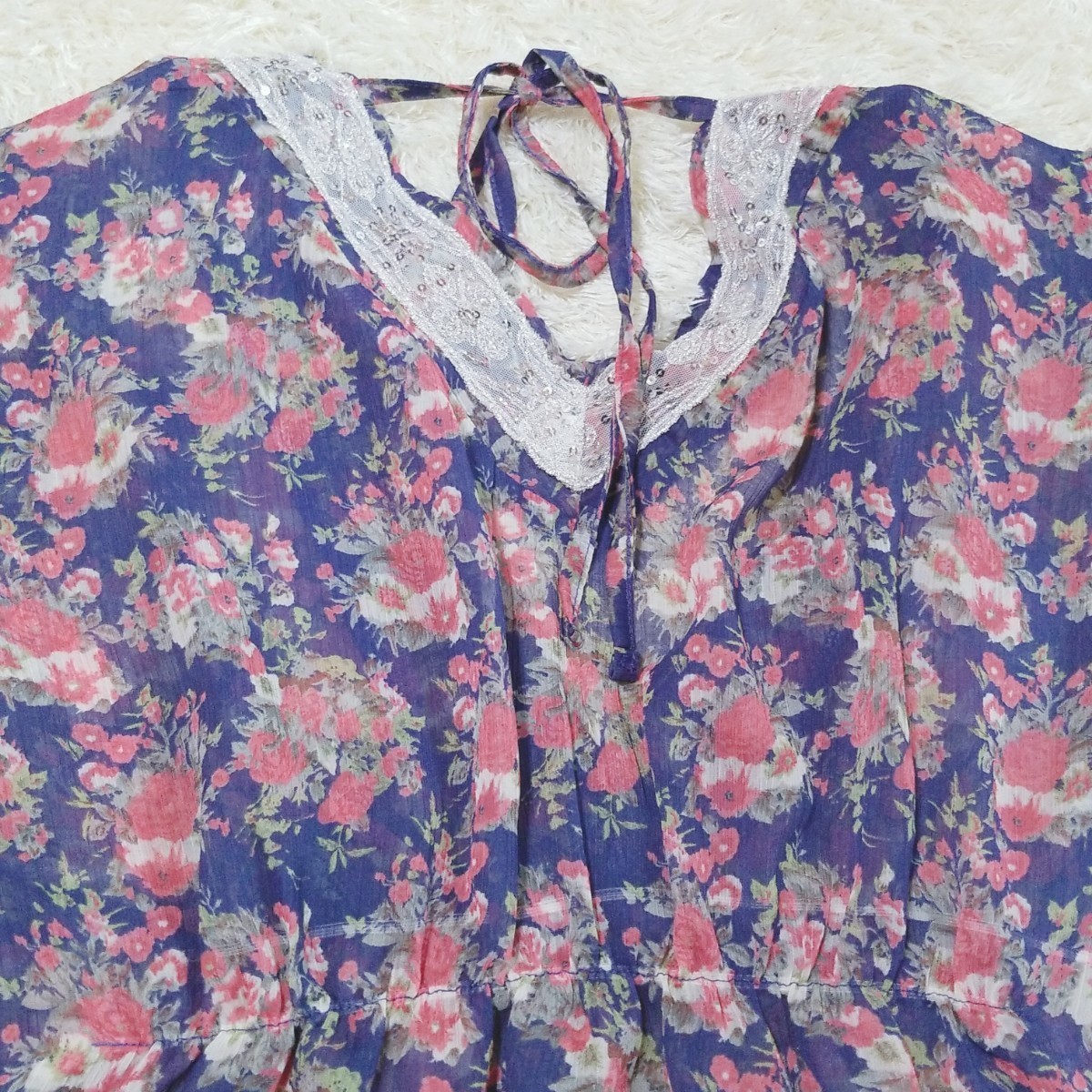 ★美品★シアーチュニック キラキラVネック フリル袖 ネイビー 花柄 日本製 Y781