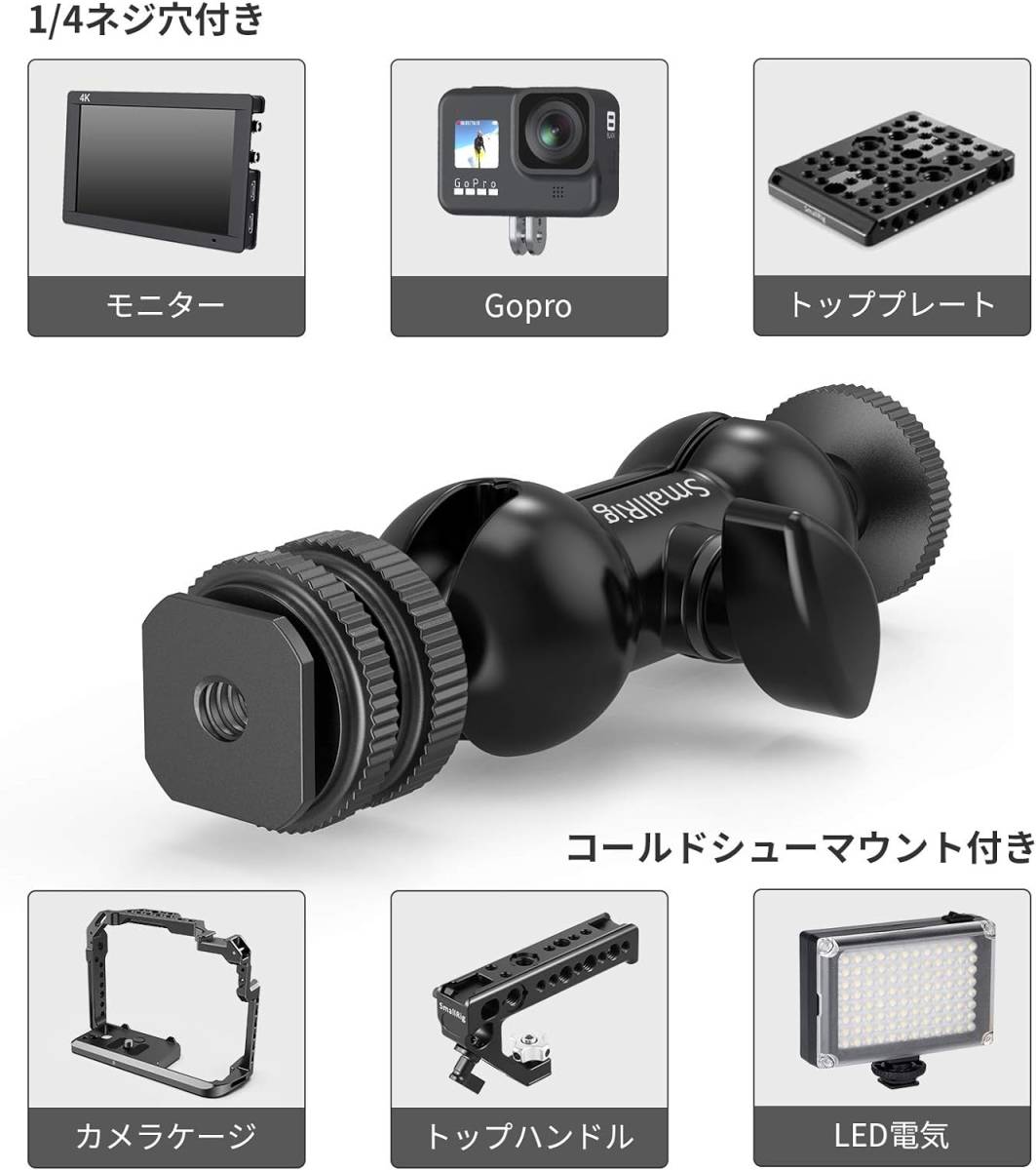 角度調整可能 コールドシュー付きダブルボールヘッド 1/4インチネジ付き