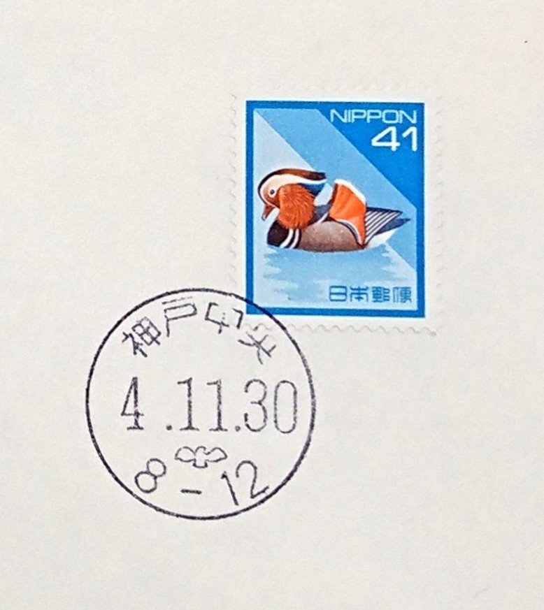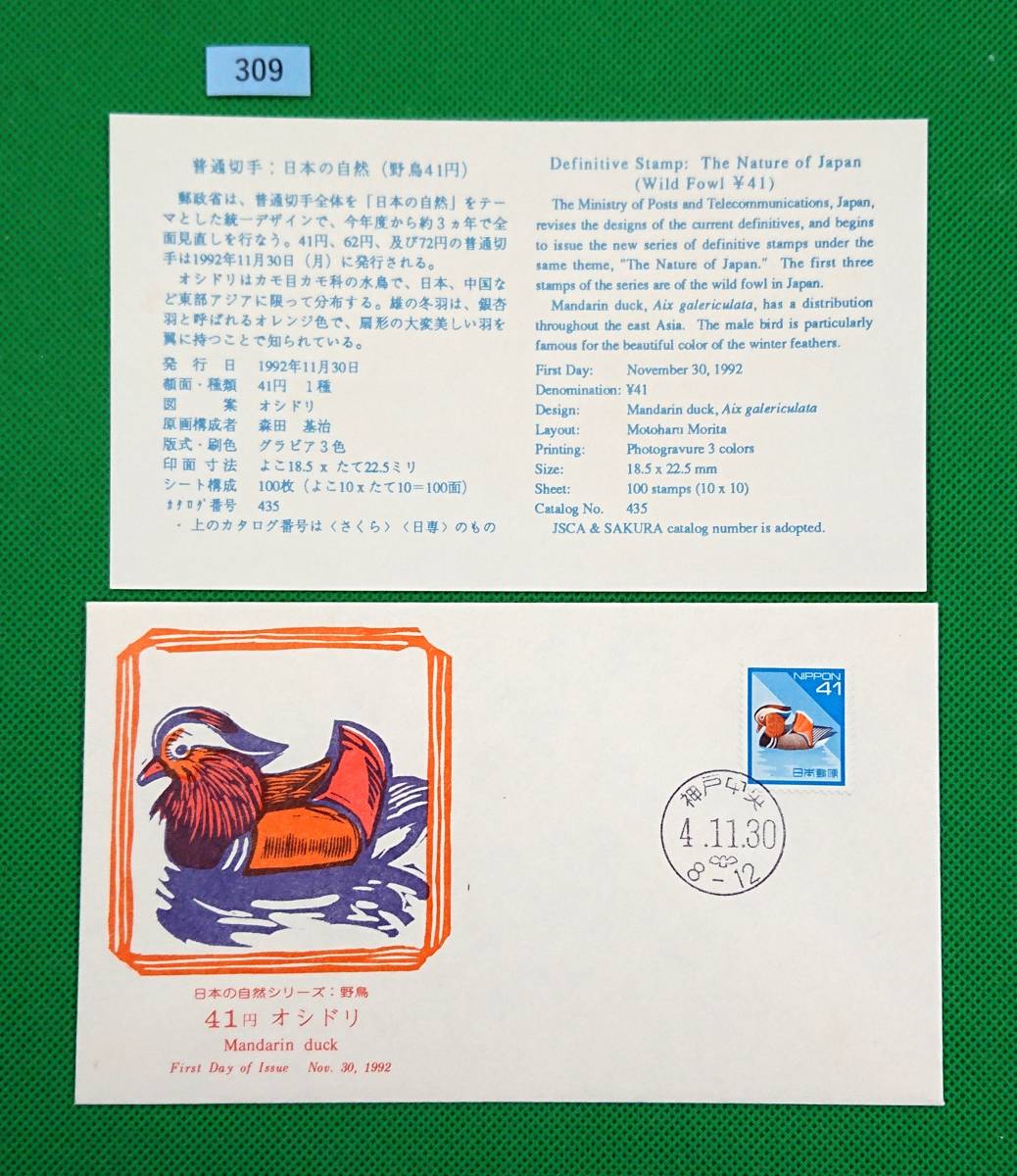 FDC/美品/ア/普通切手/日本の自然/オシドリ/初日印/神戸中央ハト印/JPS版/解説書有り/1992年11月30日/初日カバー №309