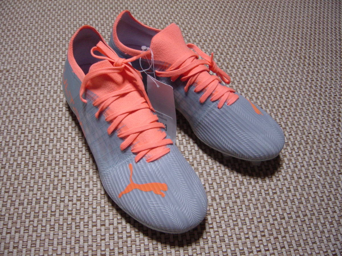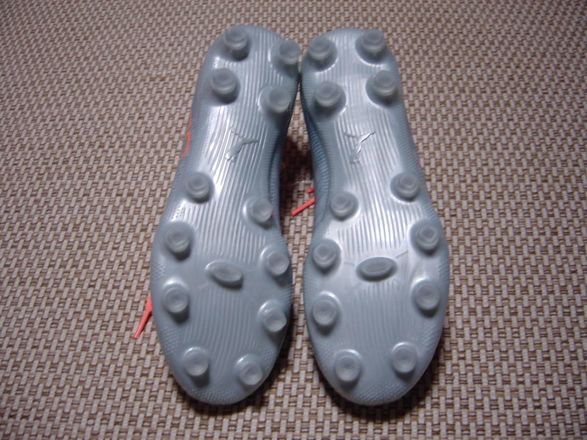 新品未使用のプーマサッカースパイクです。カラーはシルバー×オレンジで、プーマらしいスポーティかつユニークなデザインに仕上がっている一足です。サイズは25cm、軽いです。
