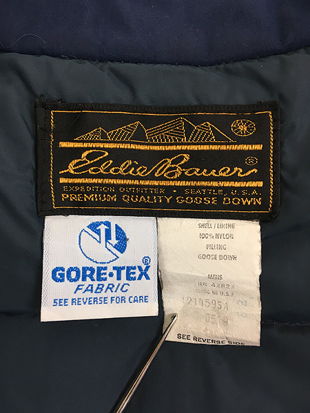 防水透湿性の高いゴアテックスナイロンシェル・内側にグースダウンがたっぷり・EB刻印スナップボタン。