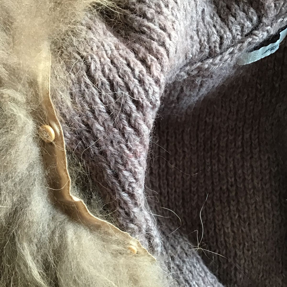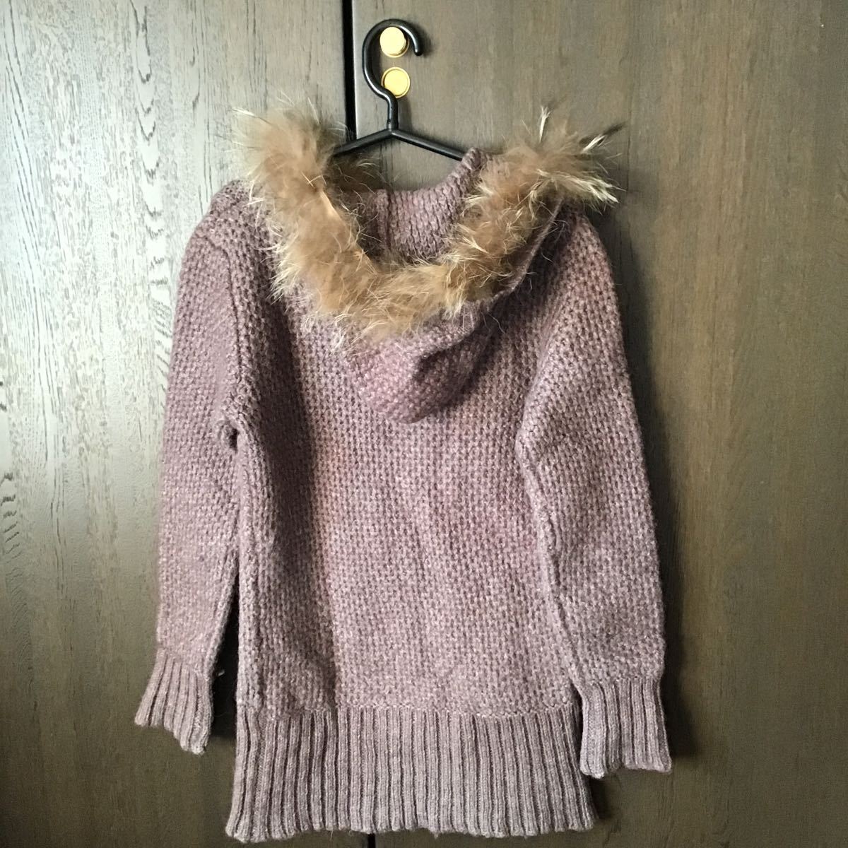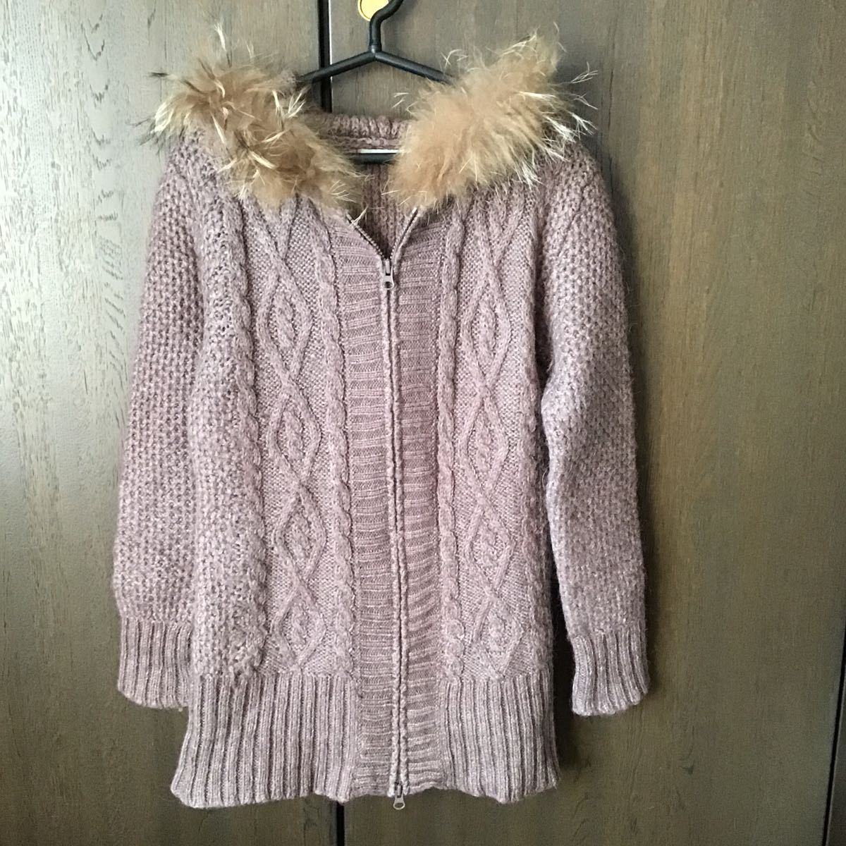取り外し可能なリアルラクーンファーと少しだけ厚みのある薄いあずき色のニットの組み合わせがオシャレなお品です♪