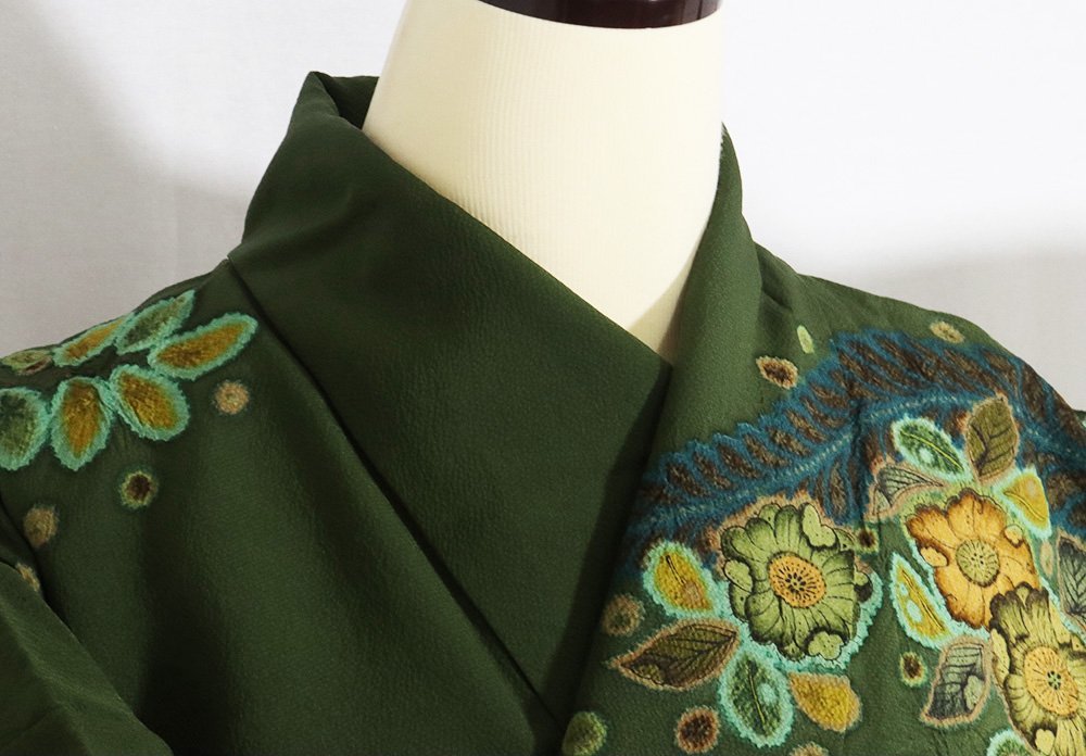| 色・柄 | 辻が花訪問着 袷 丹後縮緬地 緑・黒暈し地 絞り辻が花 (写真では上手く色が出ない場合があります。ご了承下さい) |