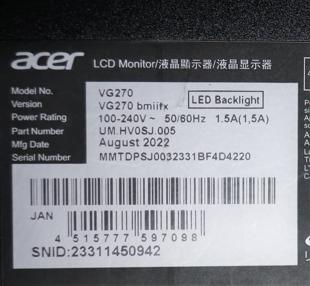 2022年製の液晶破損のお品から抽出したメイン基板です。 ※ VG270bmiixではなくVG270bmiifx用です。 acerの型番参考。 子供が遊んでいて衝撃でモニター破損をしました。 画像のように入力・起動は正常でメイン基板は大丈夫です。 接続ケーブルとスピーカーユニットはそのままお付けします。 基板固定ネジ付属します。 | |