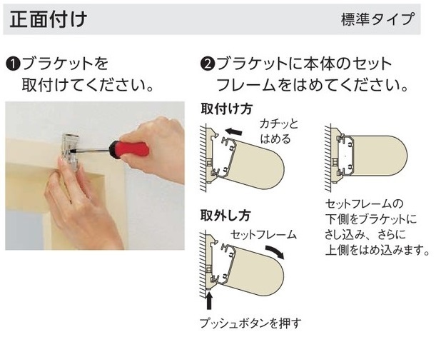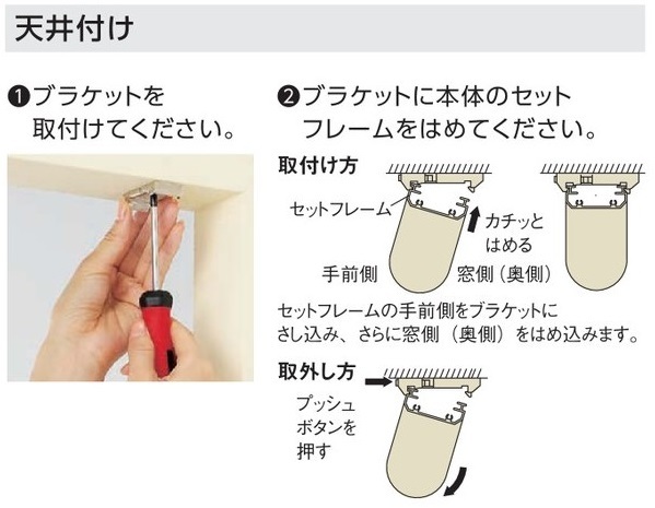 取付方法は、窓枠を隠す正面付けと窓枠無いや出窓等に取付する天井付けの両方に対応致します。