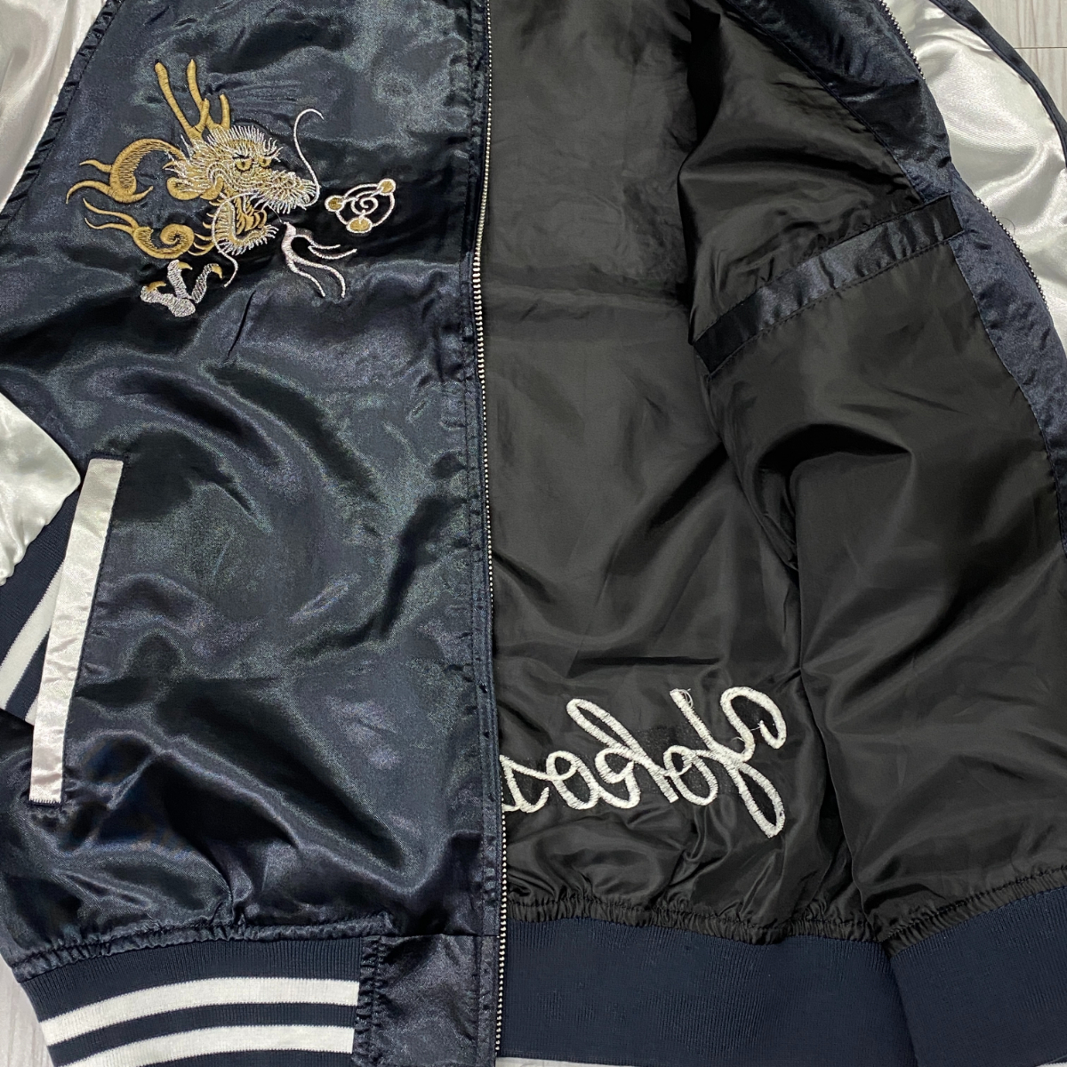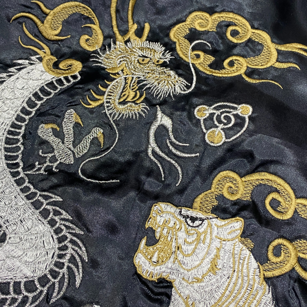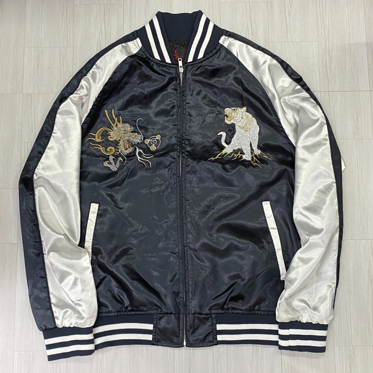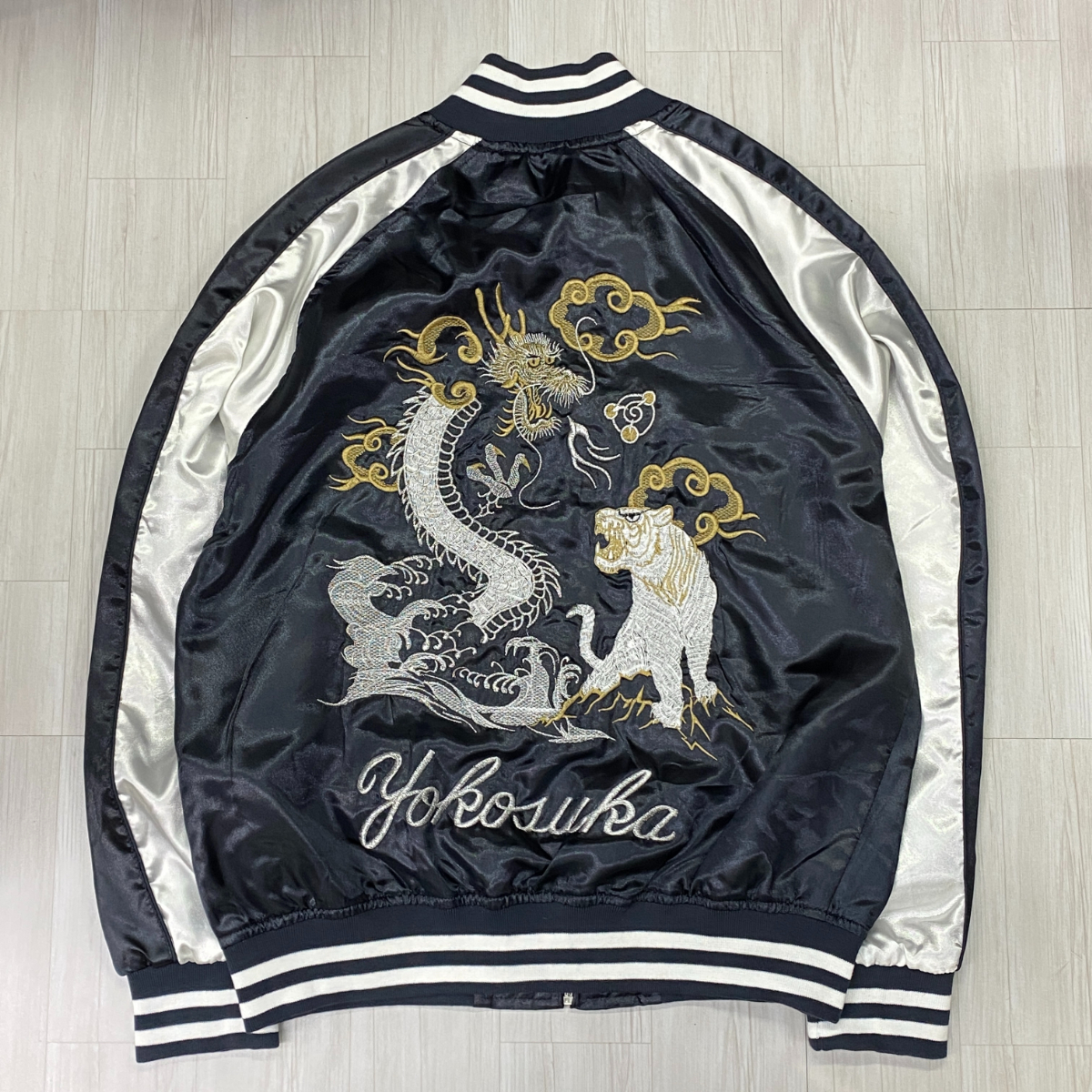 緊急SALE スカジャン 【L】 Yokosuka刺繍入り 横須賀発祥 SUKAJAN 総刺繍 タイガー&ドラゴン 龍虎 Tiger&Dragon サテン地 濃紺