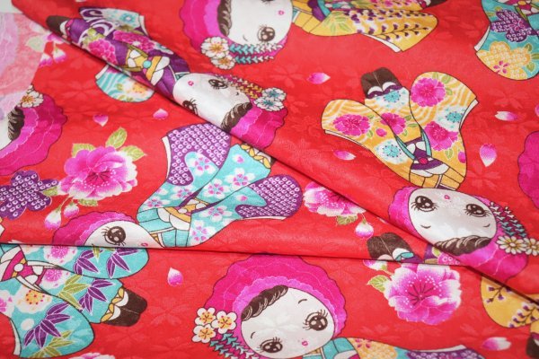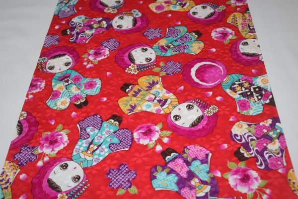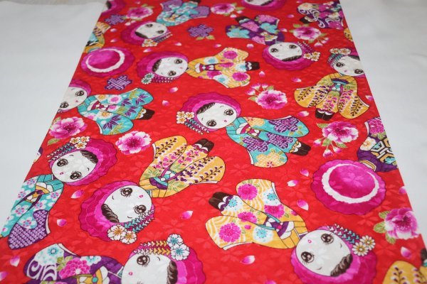 | 【京わぎれ】正絹 友禅染はぎれ お人形柄(振袖姿) 赤地 桜地紋 表物用生地 2.65m① | ||||