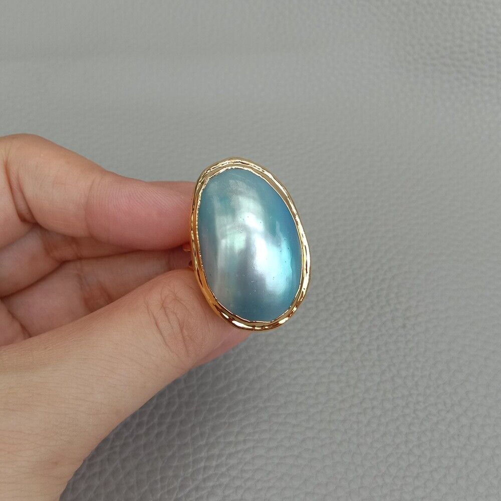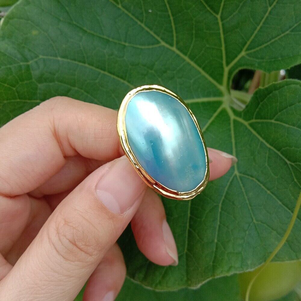 <新品>大粒 ブルー 天然 シー シェル パール 真珠 リング 指輪 フリー アジャスタブル 調節可能 結婚式 プレゼント パーティー