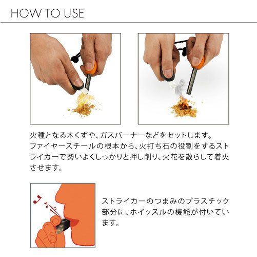 ハンドルにファイヤースチールを内蔵したブッシュクラフトナイフです。切れ味の良いナイフは、背面が発火しやすい角度に研磨されています。ファイヤースターターの発火回数は約3,000回。シースは、ベルトクリップと水抜き穴を備えています。