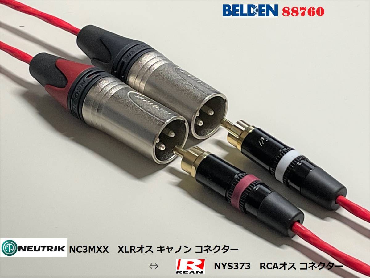 ケーブル色は 赤色 です。 ★ケーブル 米国ベルデン社 Model BELDEN 88760 を採用。 音質はフラットでクリアで聴きやすく癖がない。オーディオマニアに定評があるケーブルです。 ★XLRオスコネクター 大定番XLRキャノンコネクターNC3MXX。 組み立ても簡単でしっかりとしたハウジングが特徴。 ★RCAプラグ リアンNYS-373 を採用。 接触部は金メッキで音質・耐久性・デザイン性に優れた高品質なプラグです。 ★ハンダ Kester44で製作いたします。 ★結線方法の確認ですが (1)トランス式バランス接続(バランス側3番ColdをGNDに接続) (2)電子式バランス接続(バランス側3番ColdをGNDに未接続) と2種類あります。 ご指定ください。 ※ご指定なけれは一般的な(2)で製作します。 | ||||