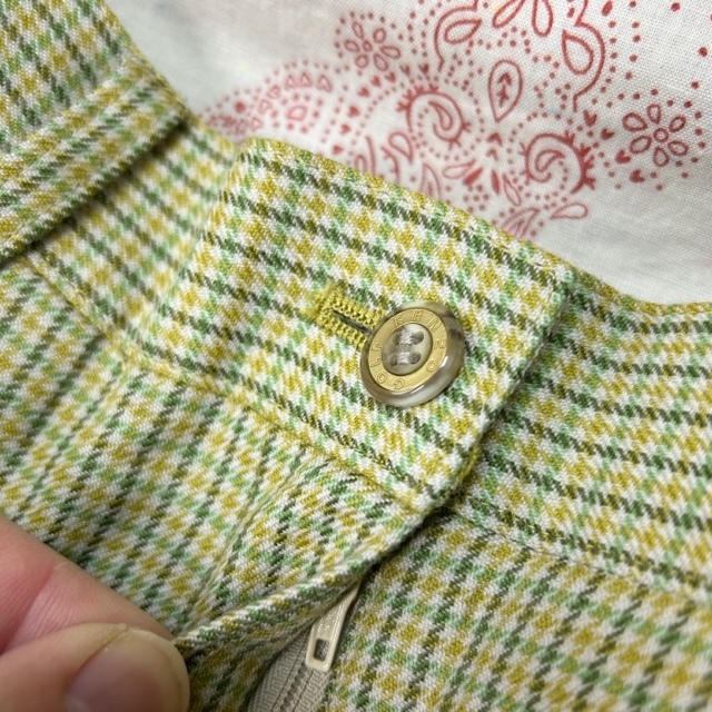 ●商品説明・・・80年代~90年代頃のオールド・ヴィンテージのdeadstock(タグ付き未使用)のケンゾーのの細かなチェック柄のスラックスパンツです。ゴルフウェアラインですが、通常のファッションとして使っていただけるレトロスラックスで、タック入りのハイウエストのゆったりしたお尻・太もも周りから、裾にかけて緩やかにテーパードしたシルエット感です。淡いライトグリーン色が爽やかで、素材はウールですが、サマーウール系のやや薄手で、春秋をメインに幅広いシーズン履いていただける生地感です。日本製で、ウエストのサイドにゴム入りでM~L程度のサイズ感かと思います。
