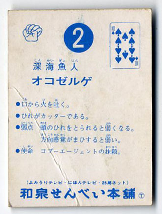 | ●超人バロム1 バロムワン ミニカード 2番 ニューカード 深海魚人オコゼルゲ 和泉せんべい本舗 さいとうプロ・よみうりテレビ・東映 特撮カード 即決 | |