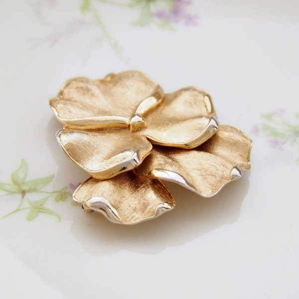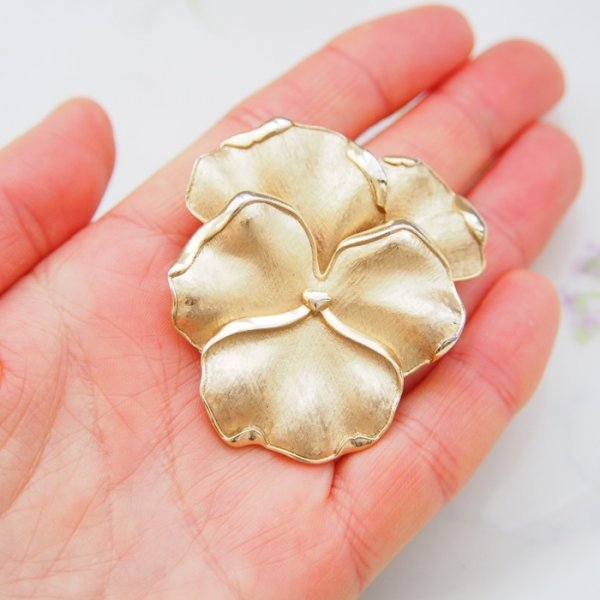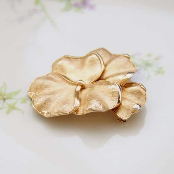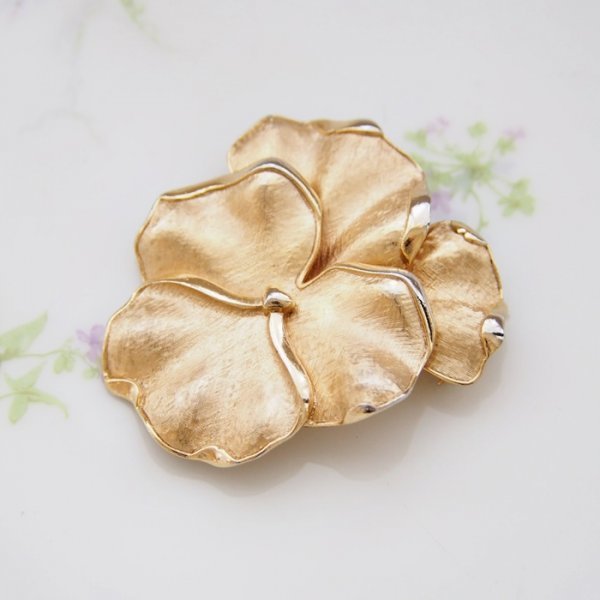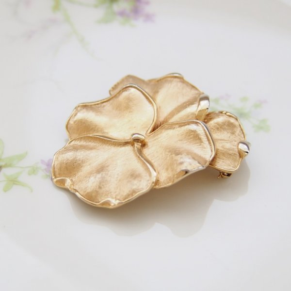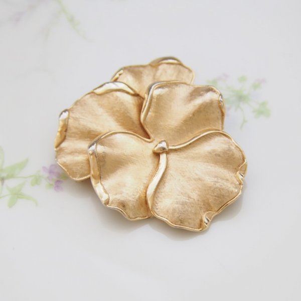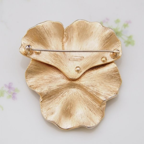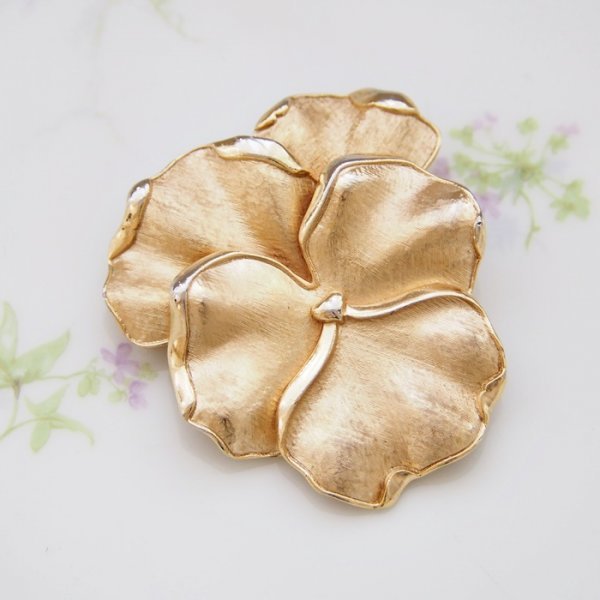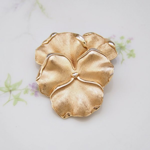 アメリカのコスチュームジュエリーメーカー、Trifariのブローチのご紹介です。 ゴールドトーンのパンジーがモチーフのブローチです。 ふんわりとした花びらがとても可愛らしいデザイン。 花びらの縁取りは鏡面仕上げとなっており、きらめきをプラスしています。 ボリュームのあるサイズで、コートやストールなどに合わせると素敵です。 お洋服以外にも帽子や鞄のアクセントにもどうぞ。 経年の為、表面に多少の小キズ、くすみやスレが見られます。 ふちの部分はコーティングが剥がれゴールドのカラーが薄くなっている箇所が多少見られます。 ■ブランド: TRIFARI ■刻印: TRIFARI© ■サイズ: 約5.5cm x 約5cm ■重量: 約32g アンティーク・ヴィンテージ商品には、経年による傷や劣化などがあります。 目立つものはアイテムの詳細に記載しておりますが、説明以外にもキズや損傷などがある場合がございます。 古いものですので、ご理解いただける方のみご入札下さいませ。 他サイトでも販売しておりますので、同時にご注文があった場合は、品切れの場合もあります。その場合は、大変申し訳ございませんが、ご注文をキャンセルとさせて頂きます事をご了承くださいます様お願いいたします。 | |||