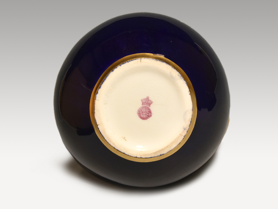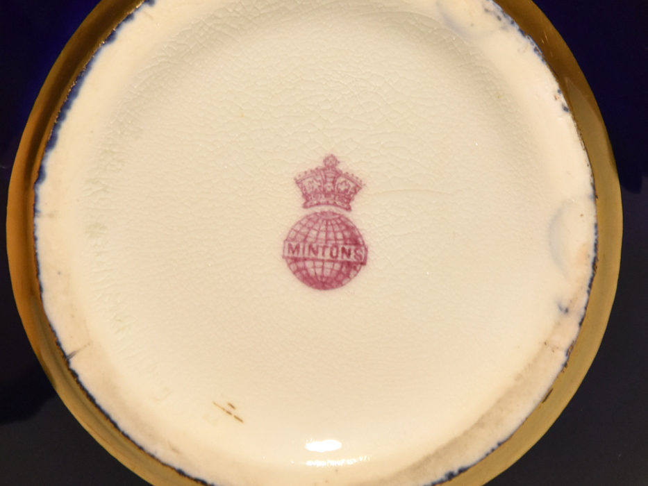ミントンのピッチャーでございます。 背景に落ち着いた紺色をペイントすることにより、お花の美しさや 瑞々しさを際立たせています。 ハンドル下部の先端部に色の塗り直し跡、高台のゴールドの周囲に 7㎜ほどの剥離が確認できます。 いずれも作品に影響を与える程度ではございません。 和をイメージさせるような個性的な作風で、アクセントにゴールド、S 注ぎ口にレイズドゴールド(金の盛り上げ技法)を施すなど細部にもこだわりが見られます。 裏面には MINTONS のスタンダードマークに王冠のスタンプ(1873~1890年) 100年以上前に製作されたアンティークのお品であるということを、ご理解の上でのご入札をお願い申し上げます。 ※撮影の際に生じた写り込みなどがございます。 ご理解の程よろしくお願い致します。 |
