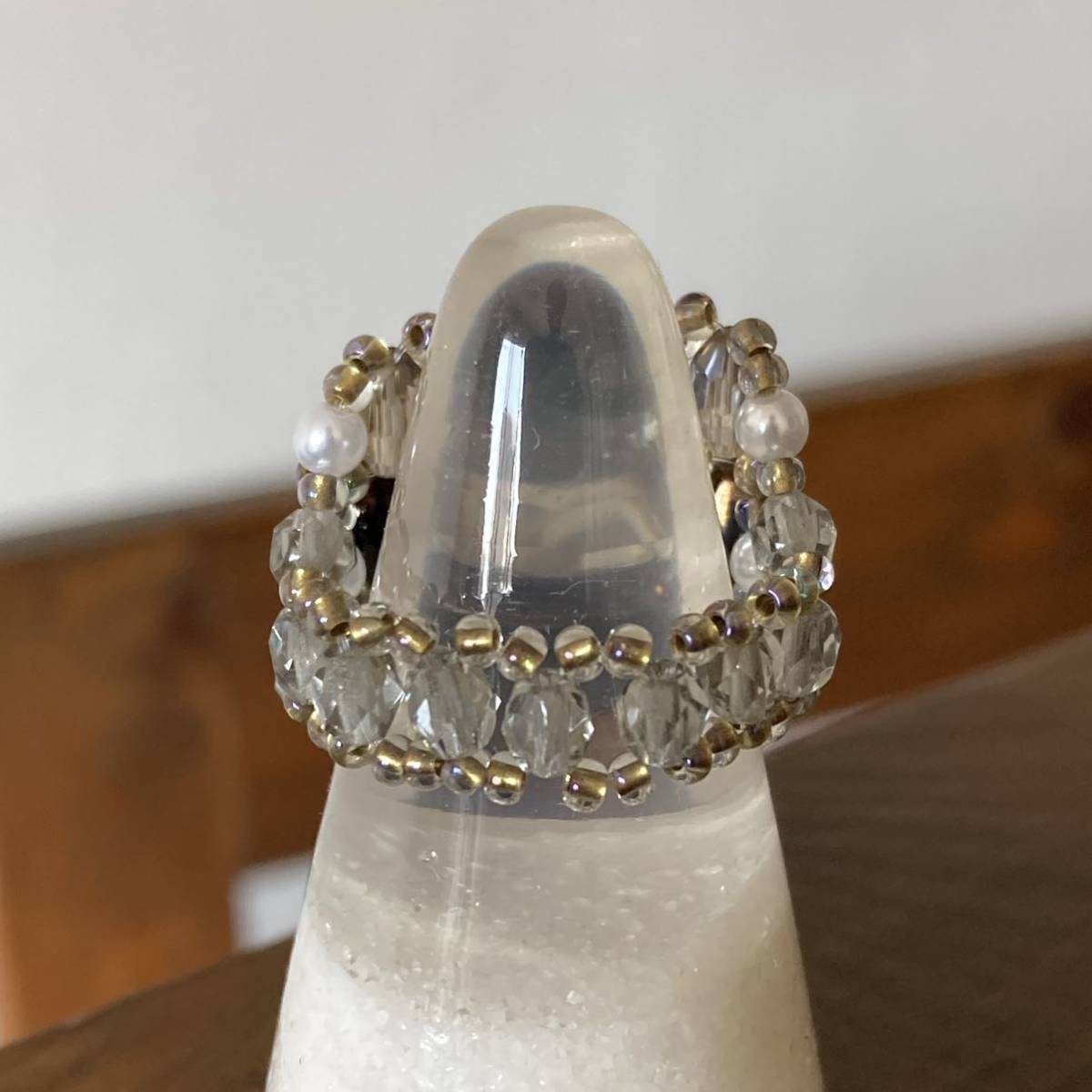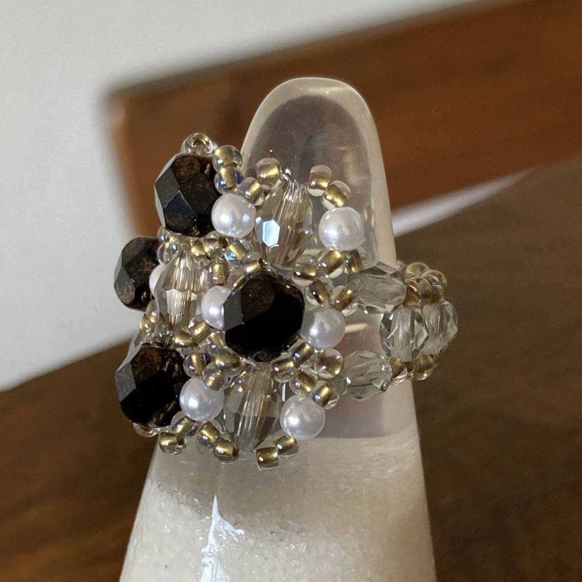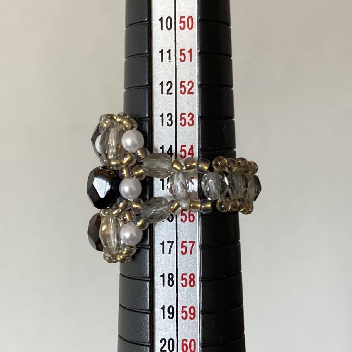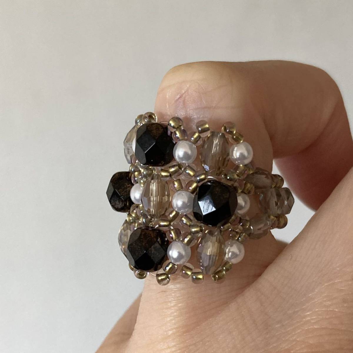 7mmのクリアグレーのナツメビーズ、6mの黒に近いブロンズのチェコビーズ、4mmのクリアグレー系のチェコビーズ、3mmの白のパールビーズ、クリアゴールド系の丸小ビーズ作ったリングです。