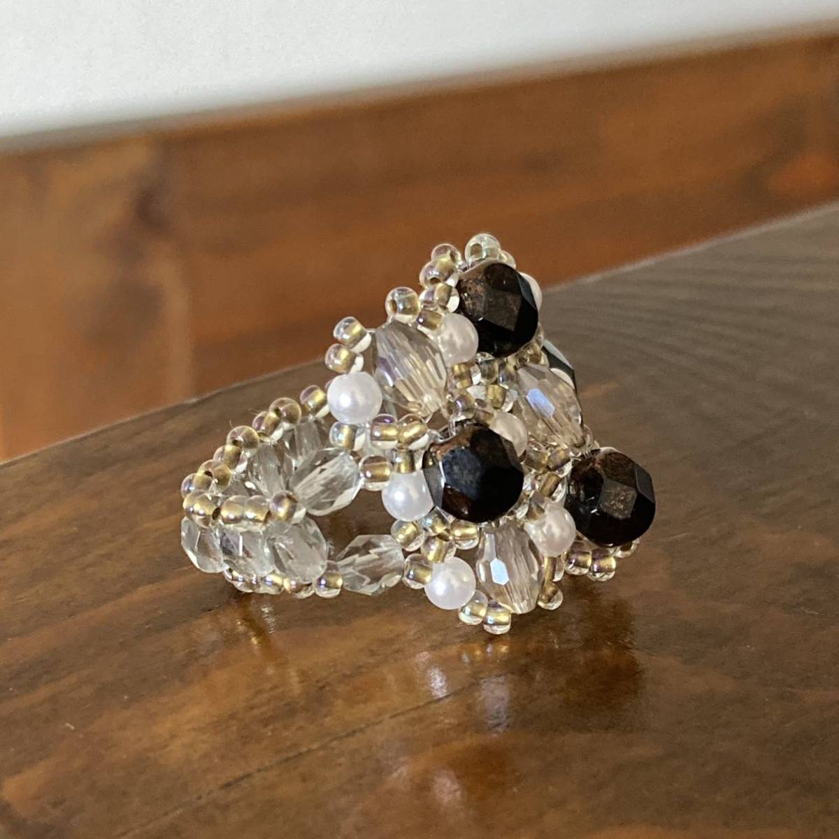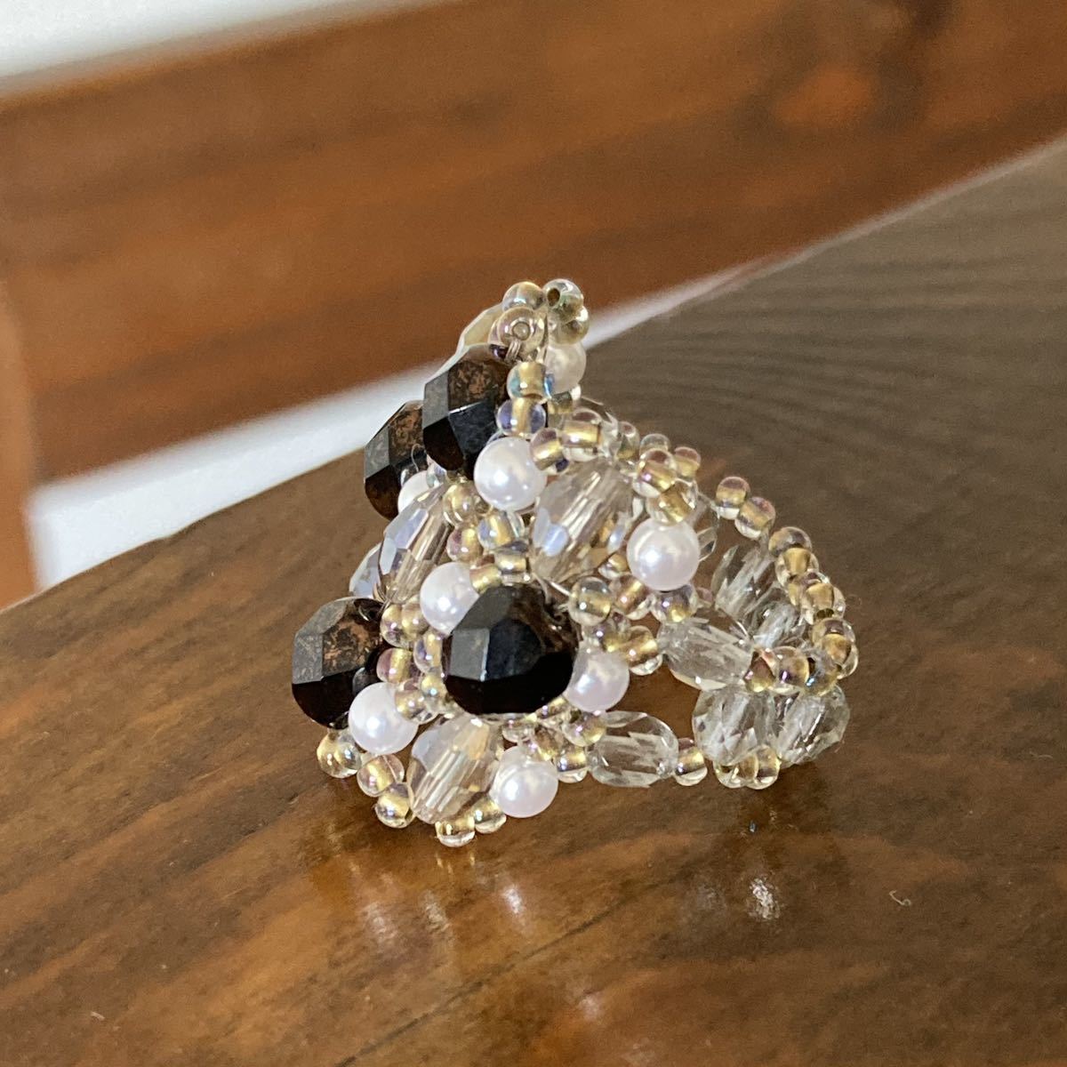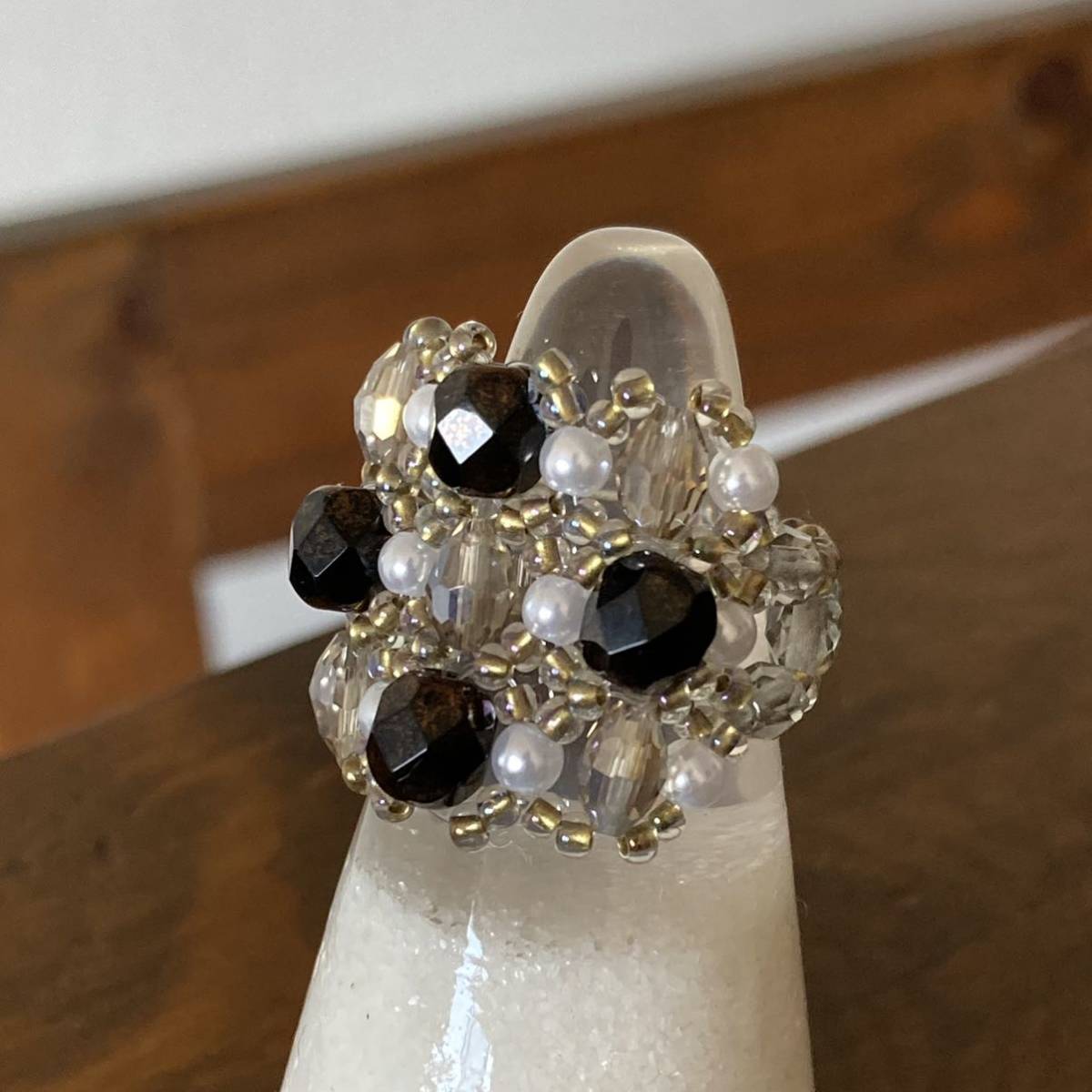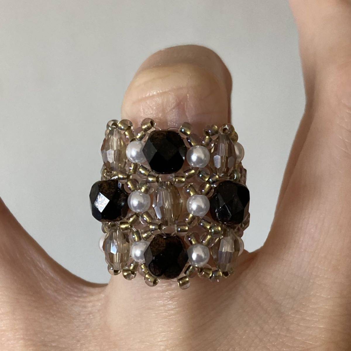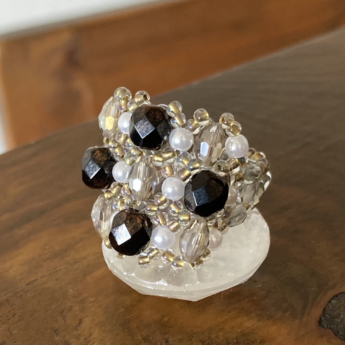 7mmのクリアグレーのナツメビーズ、6mの黒に近いブロンズのチェコビーズ、4mmのクリアグレー系のチェコビーズ、3mmの白のパールビーズ、クリアゴールド系の丸小ビーズ作ったリングです。