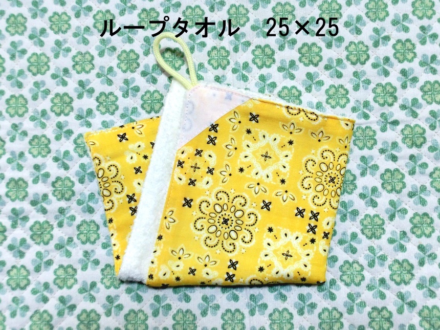 ハンドメイド・正方形25×25センチのダブルガーゼ&タオルで仕上げました、ループ付きタオルハンカチです。 ループの角は名前テープを縫い付けていますので、油性ペンで直接お名前を記入できます。 薄すぎず、厚すぎず、吸水性と速乾性にこだわりました。 型崩れ防止のために、ぐるっと一周ステッチをしてあります。 タオル生地は、肌触りが柔らかく気持ちのいいループをカットしてある国産シャーリングタオル生地を使用しております。 赤ちゃんから大人の方まで、ご使用いただけると思います。 職業用ミシンで作製しました。 手持ちの生地すべては出品できておりません。 出品中の生地でご希望の生地・ご希望のサイズがありましたら質問よりご連絡ください。 生地の在庫がありましたら、対応させていただきます。(タオル生地の色は画像と同じものになります) 商品名にご依頼者様のオーダーと記載し出品させていただきます。 サイズ:25×25センチ 素 材:ダブルガーゼ&国産シャーリングタオル生地 | ||