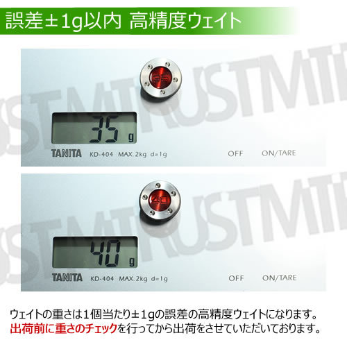 当出品商品は常時在庫完備しておりますので即納可能です。※当社休日等は除きます。 お好みに合わせたカスタムが可能! スコッティキャメロン専用 パターウェイト単品になります。 ■出荷前点検実施。高精度ウェイト ウェイトの重さは35g、40gの2種類のラインナップとなります。 誤差は1個当たり±1g以内となります。 出荷前に重さのチェックを行ってから出荷をさせていただいておりますので安心してお求めいただけます。 ※商品タイトルに記載の重さを発送しますので必ずご確認下さい。 ■カラーは全4種類のラインナップ ウェイトのカラーはレッド、ブルー、ブラック、シルバーの 全4種類のラインナップとなります。 ※商品タイトルに記載のカラーを発送しますので必ずご確認下さい。 ■ウェイト単品販売 当商品はウェイトのみでの販売となり、 取り付け、取り外しに必要な専用レンチは付属しておりません。 必要な際はレンチを追加でお求め下さい。 |