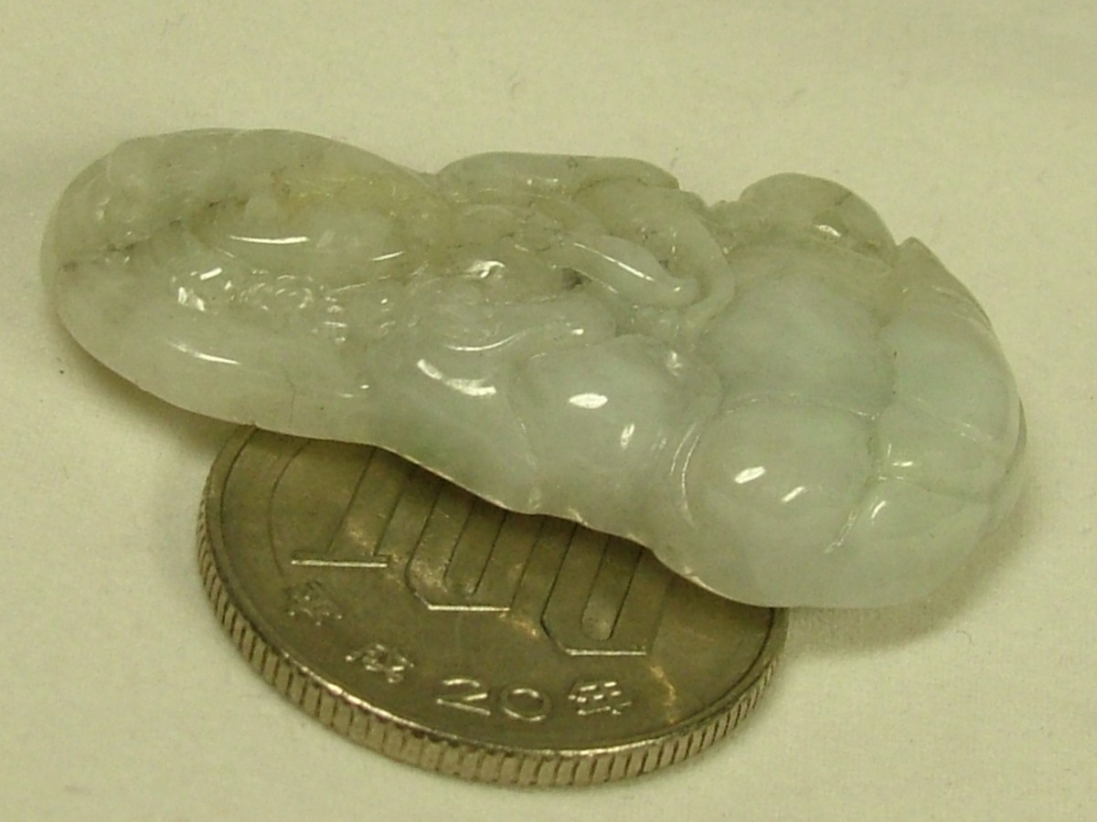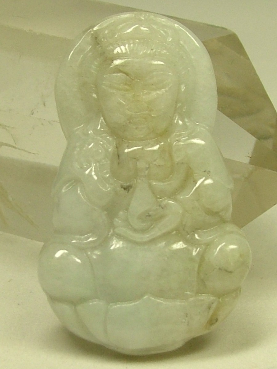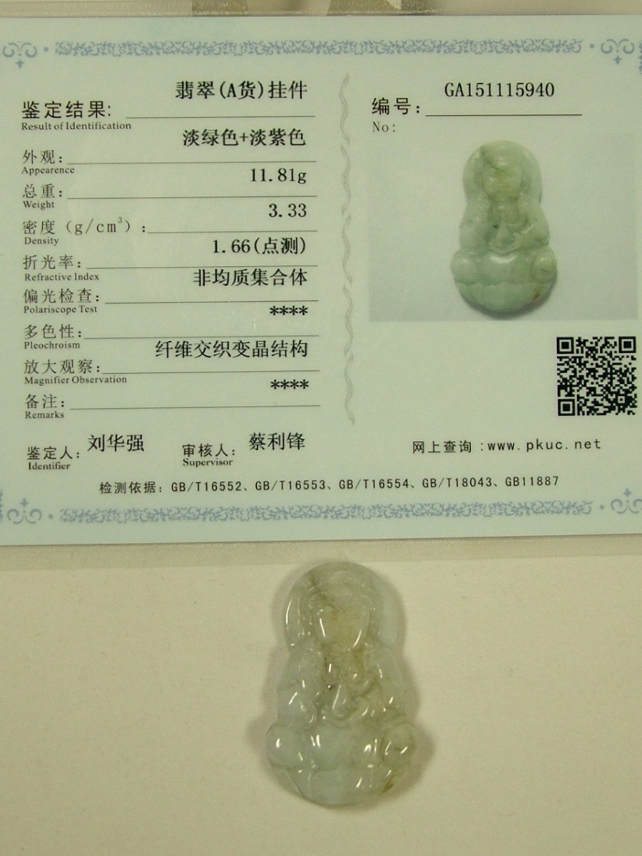 | ★商品説明★ | サイズ:40×24×厚7mm 重さ:11.8g 【材質】天然翡翠(ジェイダイト、硬玉)・俗称「翡翠A貨」・完全無処理翡翠。 こちらは色・艶・彫り全て良いA貨と呼ばれるランクのミャンマー翡翠です。縁起柄の観音様が彫り込まれています(彫りは片面のみ)。石コレクションやお守りに。上部に貫通穴が有るのでペンダントトップや下げ飾りにもなります。 ◎北京大学宝石鑑定センターの鑑定証付き。 |