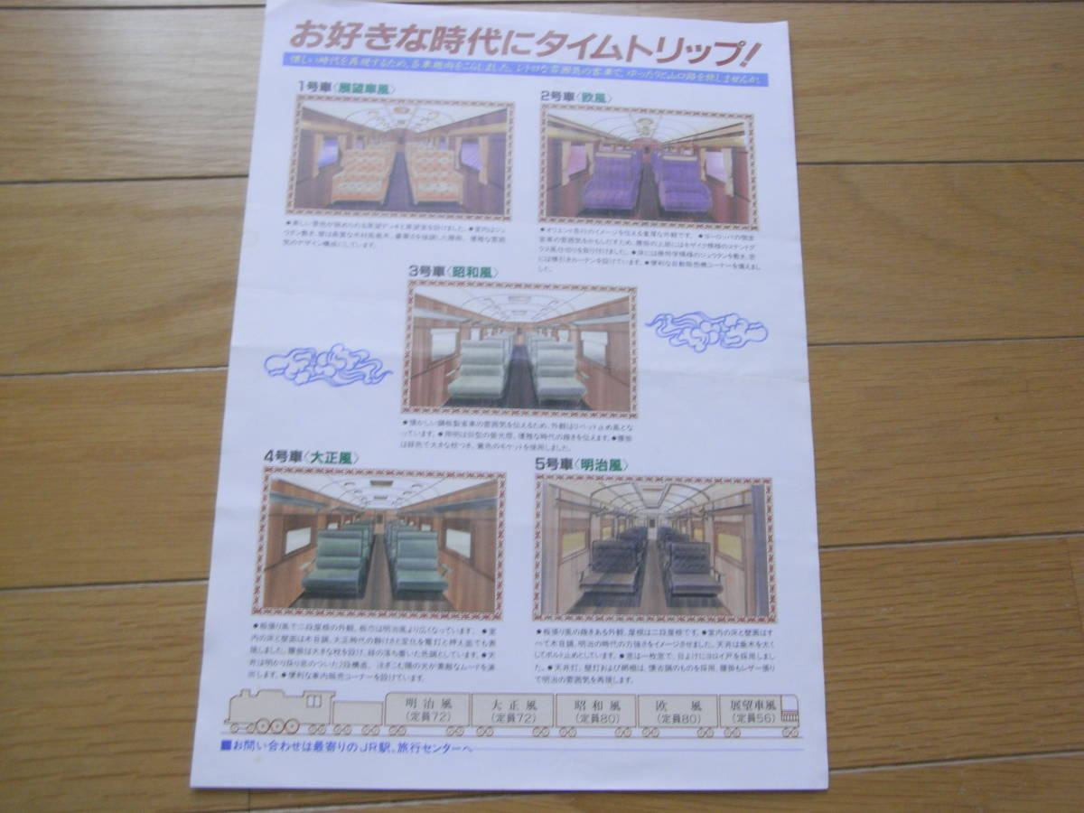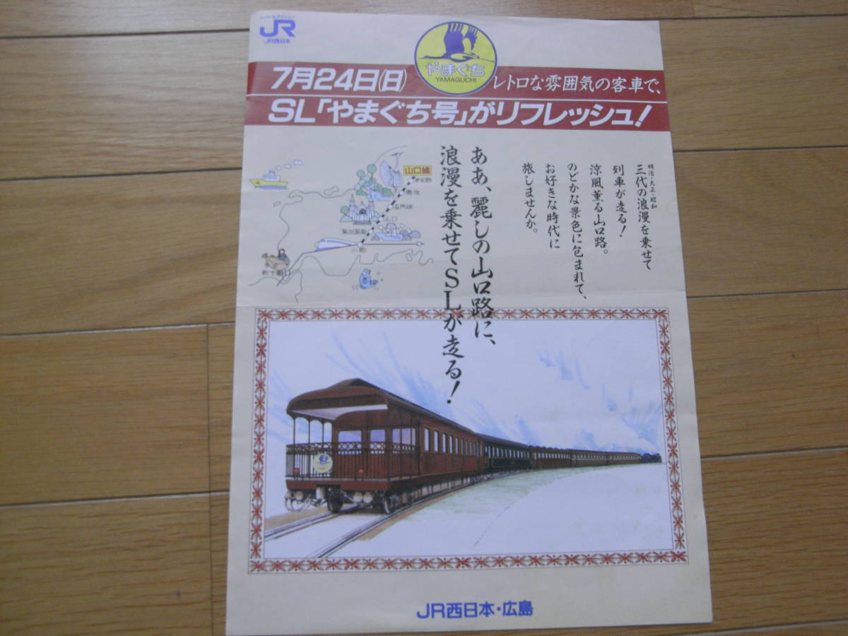 画像の1枚、表裏両面印刷の配布の案内パンフレットです。内容は画像でご確認ください。発行年は記載がありませんが、やまぐち号の客車がチラシの通りとなったのが昭和63年のため、その年の発行と思われます(推測のため、相違の際はご容赦ください)。