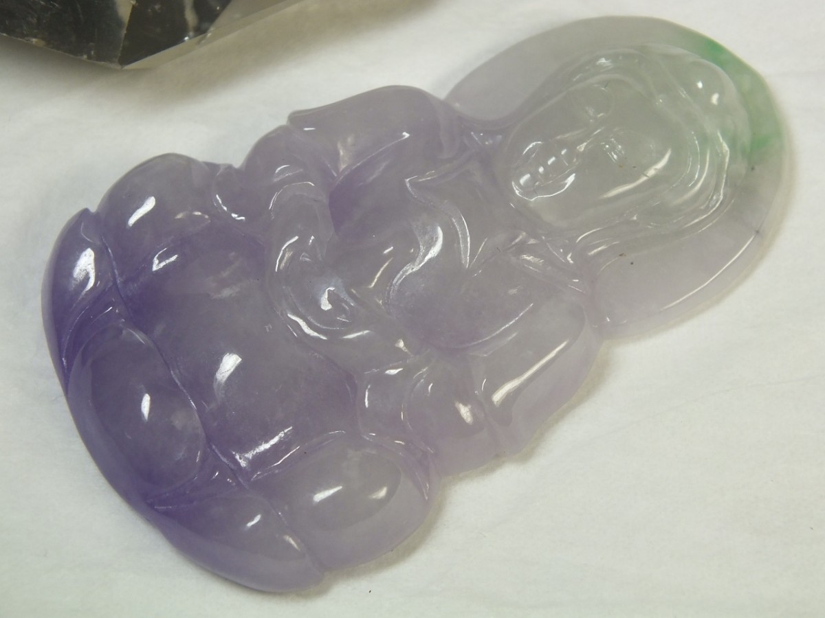 | ★商品説明★ | サイズ:58×36×厚8mm 重さ:27.3g 淡紫色が綺麗なミャンマー翡翠。縁起柄の観音様が彫り込まれています。石コレクションやお守りに。上部に貫通穴が有るのでペンダントトップや下げ飾り等にもなります。(浸含処理石) |