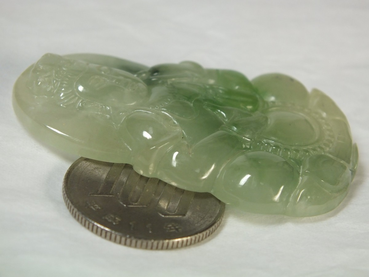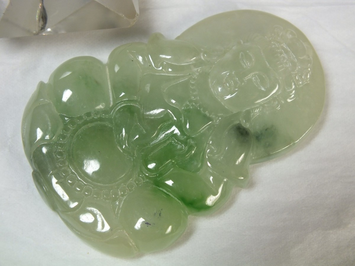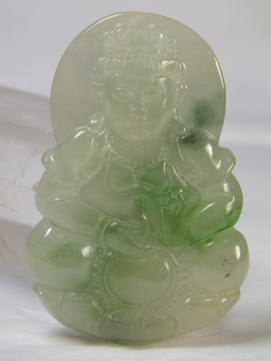 | ★商品説明★ | サイズ:54×37×厚7mm 重さ:24.6g 緑色が綺麗なミャンマー翡翠。透明感の有る氷種(アイスジェダイト)です。縁起柄の観音様が彫り込まれています。石コレクションやお守りに。上部に貫通穴が有るのでペンダントトップや下げ飾り等にもなります。 (浸含処理石) ◎商品につきましては注意を払った検品を行っておりますが、稀に表面及び内部に線状の筋が見受けられる場合が御座います。それは石本来の石紋で傷ではありません(割れが生じ易いヒビではありません)。返品の対象にはなりませんのでその旨御了承の上、ご検討下さい。 |