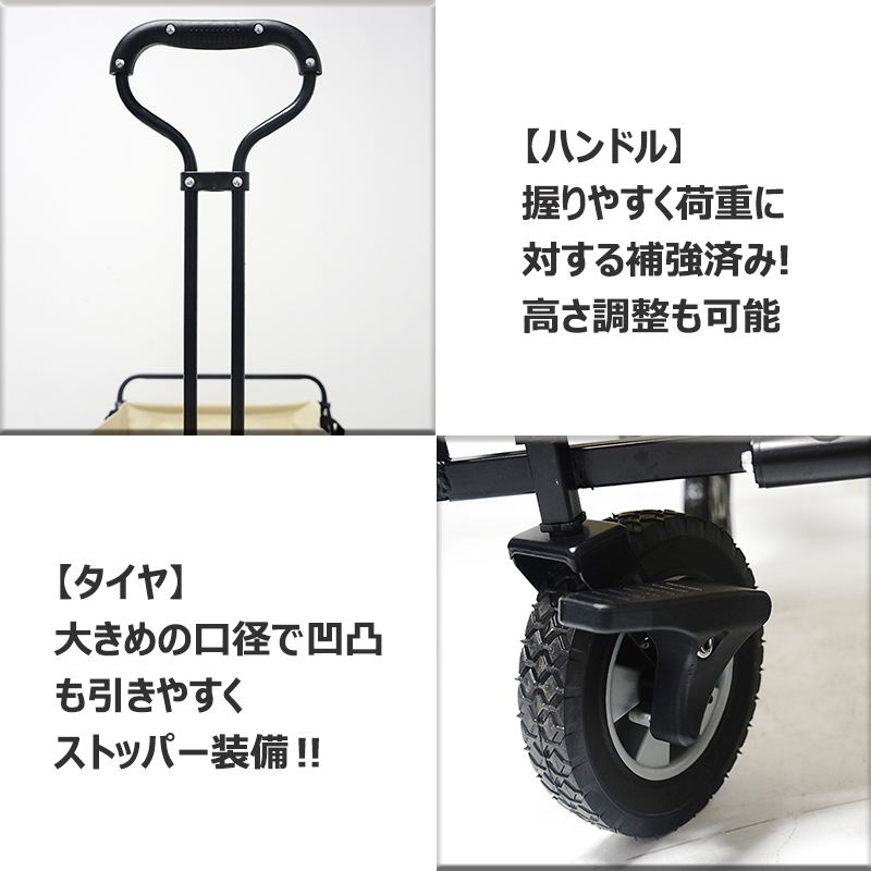 | ★こちらはCHANODUG OUTDOORアウトドアカートワゴン(折りたたみ式ワゴン)になります。 ★まだ台車で荷物を運びますか?カートワゴンで運搬もオシャレに! ★カート(キャリー)ワゴンは、子供を乗せたりペットを乗せたり、また荷物を載せてキャンプ場やビーチ等の未舗装路でも簡単に移動&運搬が出来ます。 ★アウトドアに限らず釣り場やフェス、イベントなどの搬入、搬出時にも大活躍♪。 ★使用時以外は折りたたんでコンパクトになり無駄にスペースを取る事もありません。 ★そしてこの商品、日本国内には入荷が無い為目立つこと間違いなしです。 ★荷物がスムーズに運べるよう、タイヤにもこだわりが見られます。大きめのタイヤを搭載しているため未舗装の道でもスムーズな走行が可能で、前輪は360度回転で方向転換も楽々!! ★前輪タイヤには安全のためロック機能がついておりより安全に使用できます。 ★組み立て不要のカンタン折りたたみ構造。収納ケースも付属。 ★折りたたんだ状態で移動することも可能です。伸縮できるハンドルはお好みの高さに固定できます。 ★使い方はお客様次第!さまざまな物を運ぶことができ、使い方は無限大です。★ 商品仕様 ★サイズ (使用時)約52cm×約98cm×約100cm★ ★ワゴン容量: 開口部(約)幅45× 奥行き80× 高さ25cm 約90L★ ★折りたたみ時サイズ:(約)幅52cm×奥行き20cm×高さ77~100cm★ ★重さ:約10kg★ ★重量制限:約80kg★ ★付属品:収納カバー★ ★カラー:ブラック★ ※サイズ違いや色違いのオフロードカートワゴンや各種キャンプ用品も取り扱いしております。 合わせてご検討下さい。 ※細部のデザインは製造ロットにより予告なしに若干変更になる場合がございます。 何卒ご了承願います。 ※海外輸入品に付きスレ、キズ等がある場合がございますので、何卒ご了承願います。 ※良いものをより安く提供できるよう、エコ梱包させていただいております。 ★初期不良時はパッケージ・付属品などが全て揃っていない場合、交換対応いたしかねますので廃棄・紛失にご注意ください。 ... 保証サポートをする国内代理店が無い海外製品、国内市場向けに提供されていない海外メーカーの並行輸入品なども保証期間は到着後7日間です。必ず取引連絡より連絡を行ってください・到着後7日を超える物の交換・返品・修理など一切の対応をいたしかねます。★ ★必ず上記の点を御了承いただいた上でのご購入をお待ちしております★ | |||