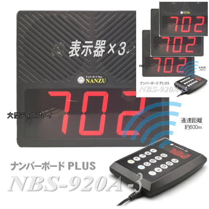 病院や銀行、飲食店などで受け付け番号を表示するワイヤレスシステム ナンバーボードPLUSです。従来型と比べると大きなディスプレイで見やすくなり、外部機器を接続する端子が搭載されました。また通信距離も約600mになりました。送信機1台と表示器3台のセット構成品です。