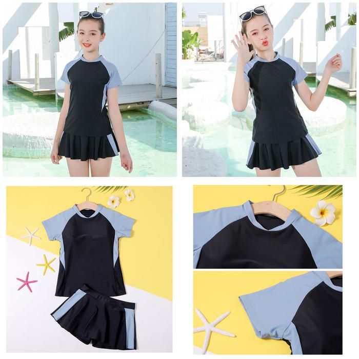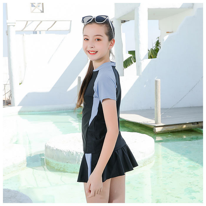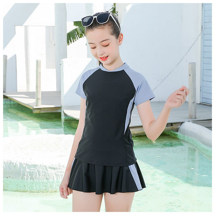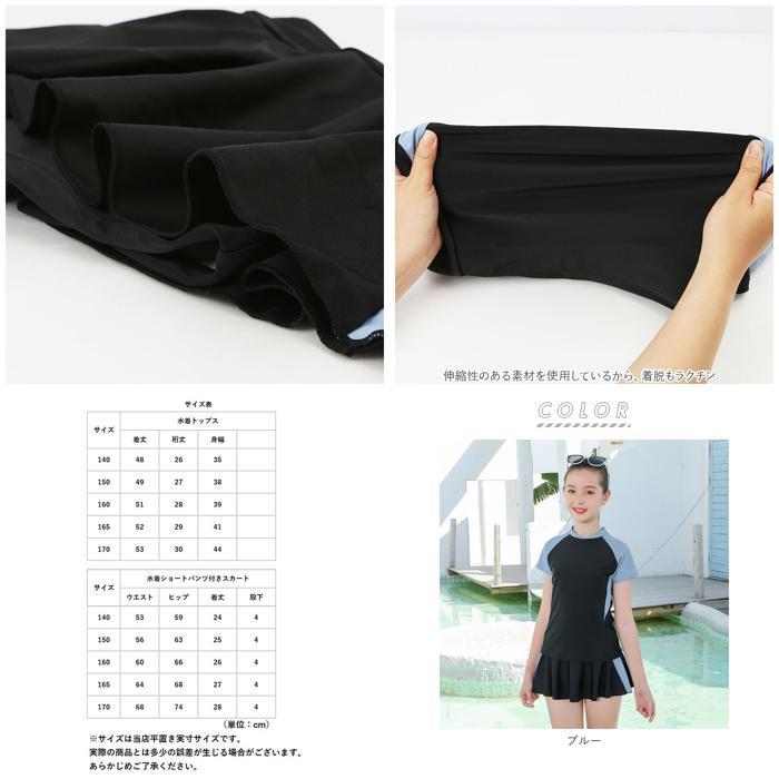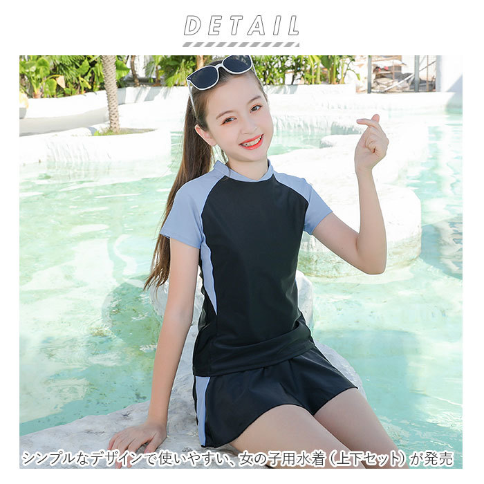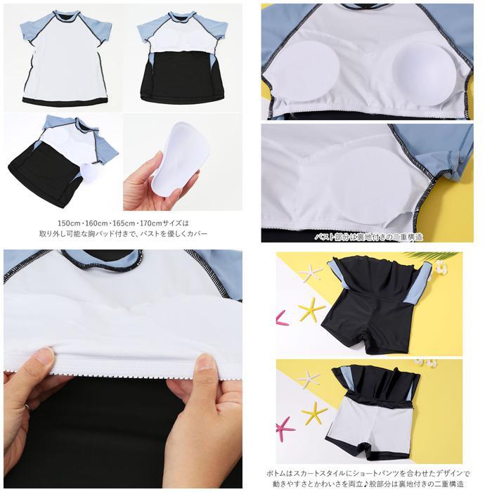 商品説明 | ・シンプルなデザインで使いやすい、女の子用水着(上下セット)が発売。 ・トップスは首周りが広すぎないラウンドネックに、肩や腕が動かしやすいラグランスリーブデザインの半袖タイプ。 ・ボトムはスカートスタイルにショートパンツを合わせたデザインで動きやすさとかわいさを両立。 ・バスト、股部分は裏地付きの二重構造。150cm・160cm・165cm・170cmサイズは取り外し可能な胸パッド付きで、バストを優しくカバー。 ・上半身のサイドやスカート裾部分に施されたライン使いがアクセントに。伸縮性のある素材を使用しているから、着脱もラクチン。 |