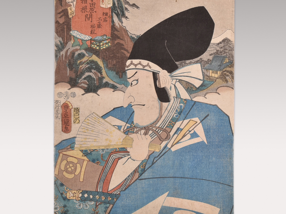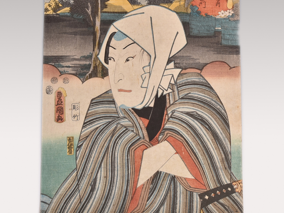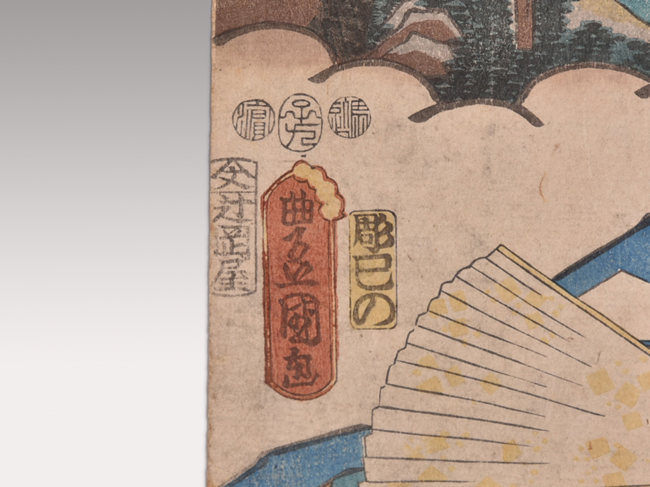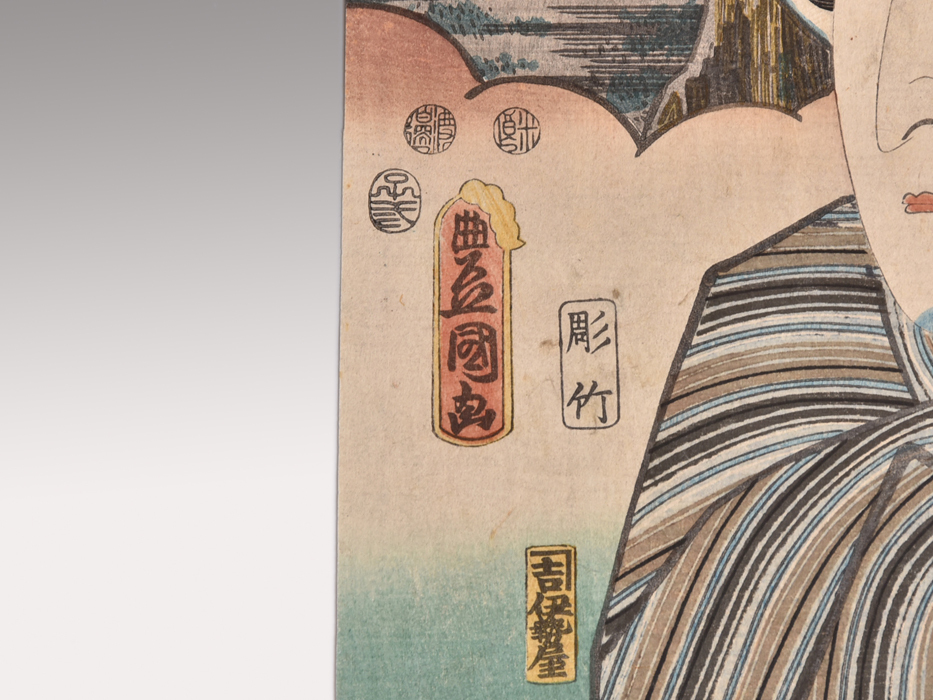 三代 歌川豊国 (うたがわとよくに 1786年 - 1864年) 弘化元年(1844年)に豊国の名を襲名 華やかな役者絵や艶麗な美人画を得意とし 流行を敏感にとらえた画風で一躍庶民の人気を集めた 画号は 五渡亭(文化8年~天保末) 香蝶楼(文政10年から嘉永初) 一雄斎(文化9年~) 琴雷舎(文化10年) 北梅戸 富望山人 富望庵 桃樹園 応好 月波楼(文化8年) 喜翁(文久2年) 国貞舎豊国 雛獅豊国 浮世又平 不器用又平 など多く使用した |