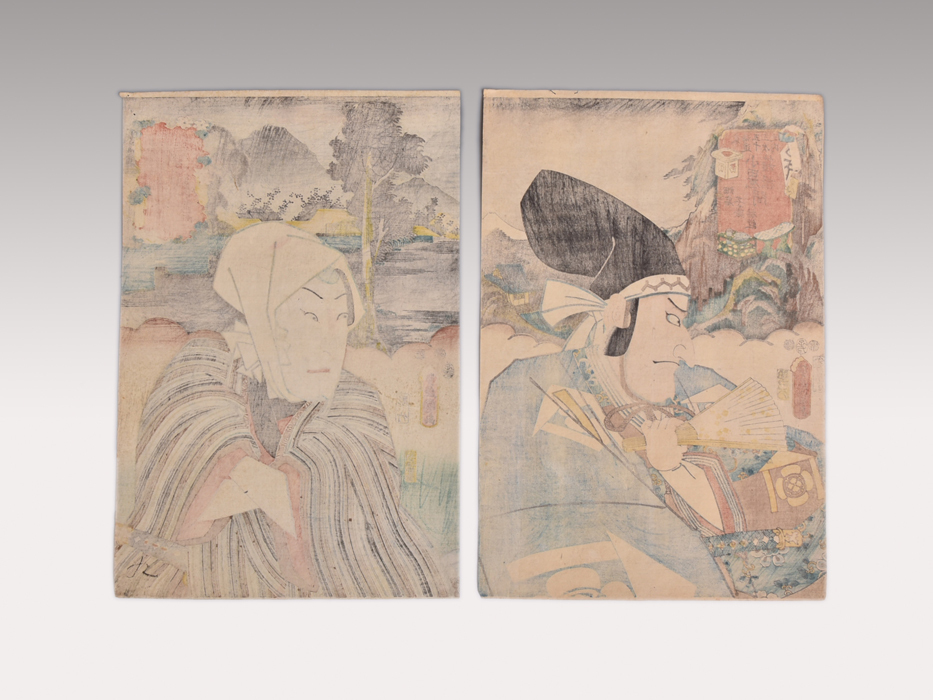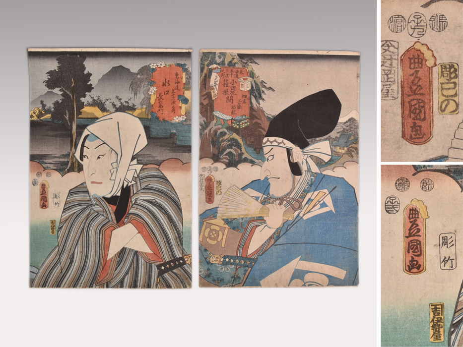 【真作】 三代 歌川豊国 大判錦絵 「東海道五十三次の内(役者東海道)」より 二枚 セット まとめて 錦絵 浮世絵 歌舞伎絵 役者絵 版画 木版 木版画 絵画 書画 |