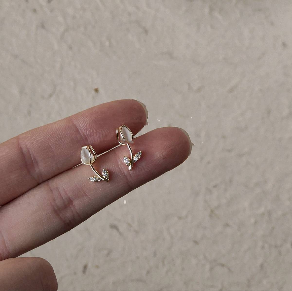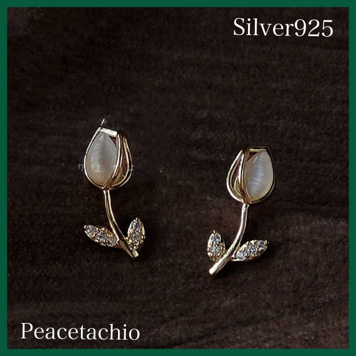 キャッツアイを花びらに見立てた、可愛らしいチューリップ。キラキラ輝き、華やかなピアスです。