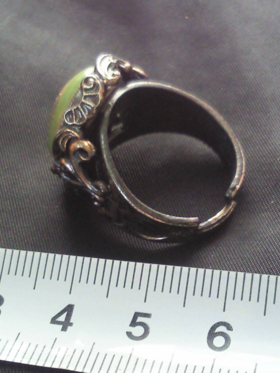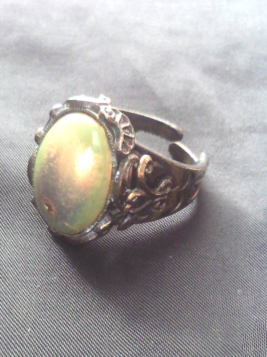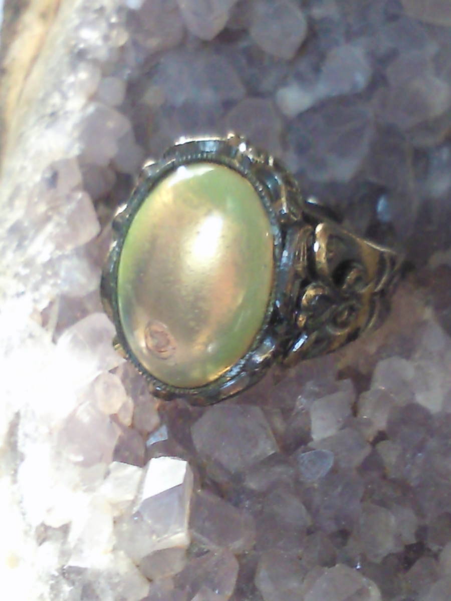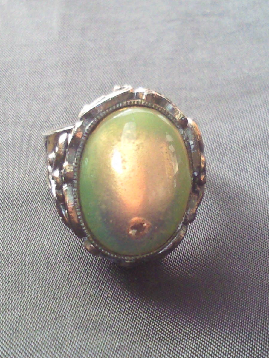 西洋七宝アンティーク指輪●年代物エクボ有ハンドメイド伊製リング●青の洞窟グリーン系オーバル●ヴィンテージ銀装飾レトロ骨董●送料無料