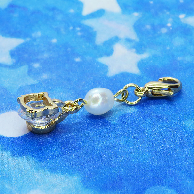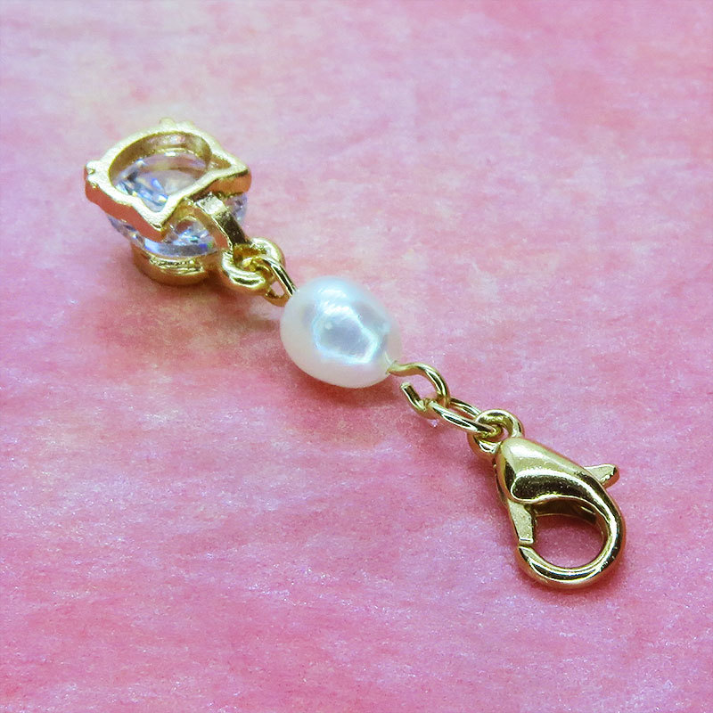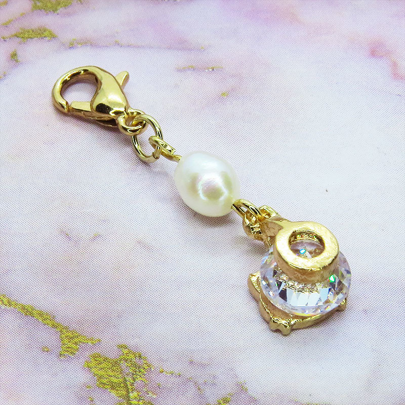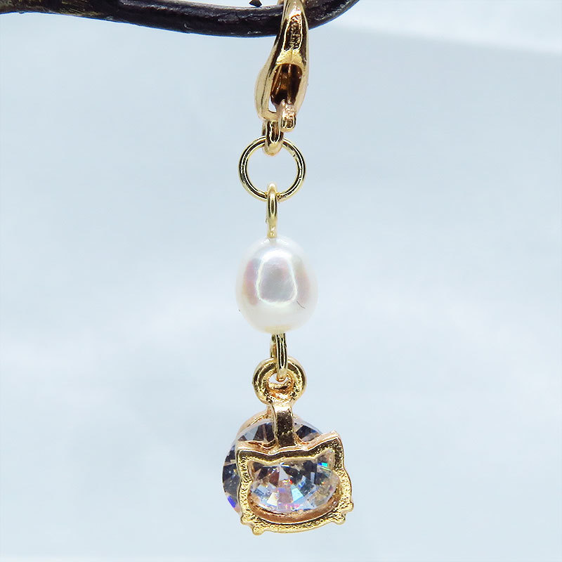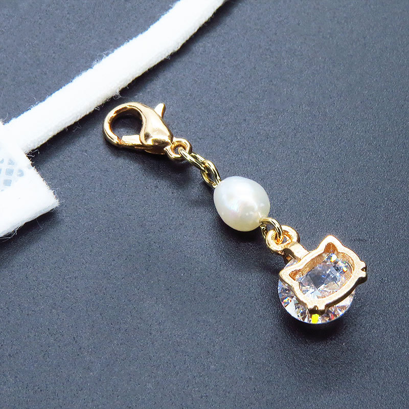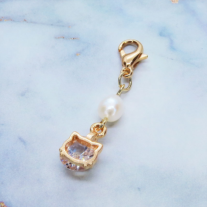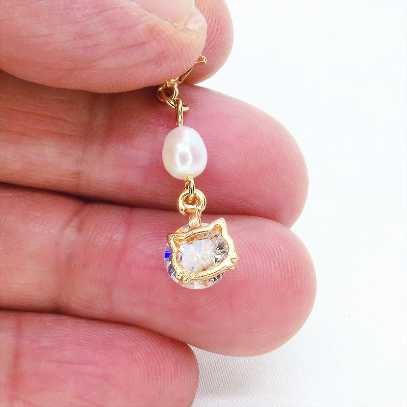 ゴールドカラーの猫フェイスフレームに大粒のキュービックジルコニアと淡水パールを組み合わせた大人可愛いチャームです